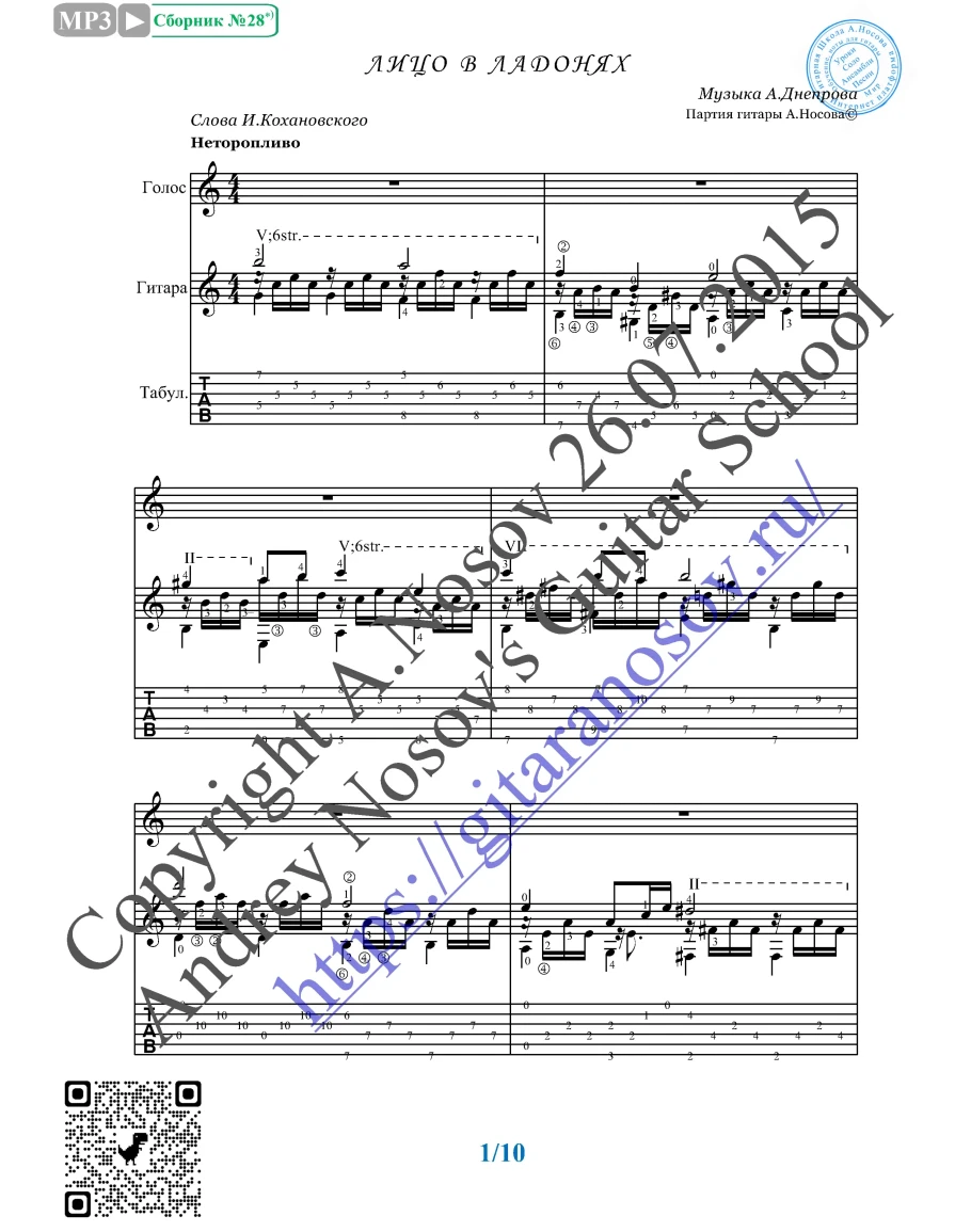 Кликните "Подробнее" для получения дополнительной информацииВашему вниманию предлагается композиция "Лицо в ладонях (муз.А.Днепрова, сл.И.Кохановского)", предназначенная для вокала в сопровождении 6-ти струнной гитары (pdf / png*). Запись выполнена нотами и включает в себя партию вокала с подтекстовкой, партию гитары с подробнейшей аппликатурой, текст песни (НА РУССКОМ ЯЗЫКЕ). Партия гитары продублирована табулатурой. Прилагается ссылка на скачивание mp3.