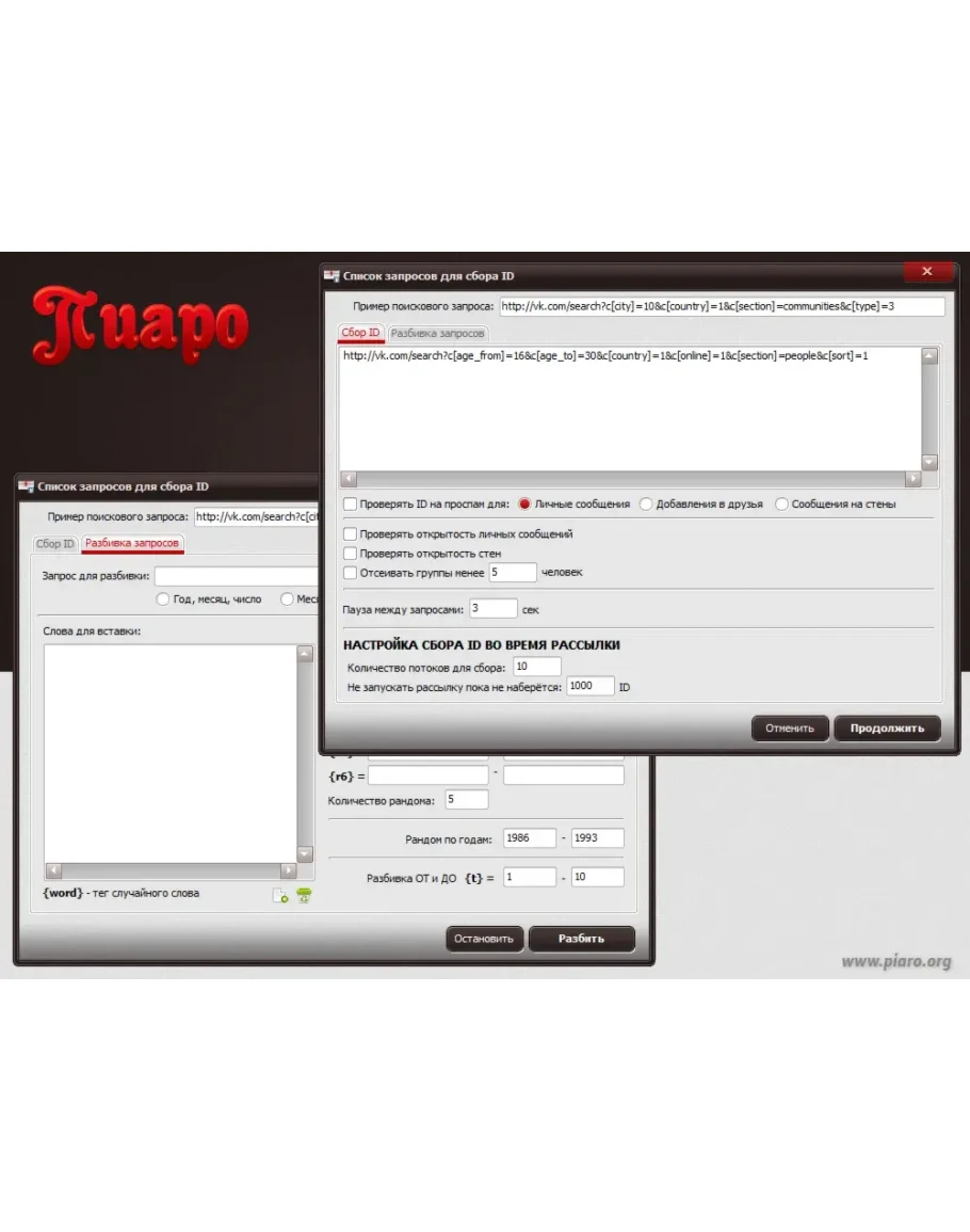 - рассылка в ЛС по списку ID и по друзьям (все/онлайн/онлайн/"возможные друзья");