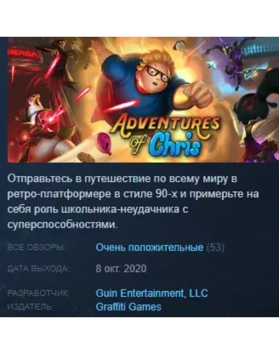 Ого! Не думал, что вы досюда дочитаете... Круто! Кстати, меня зовут Крис. И мне не терпится рассказать вам о своей игре! Это приключенческий платформер в духе 90-х о, казалось бы, «обычных» событиях, которые произошли со мной в 1995 году, когда я еще был пухлым школьником. Именно благодаря этим событиям мне удалось увидеть мир, получить множество полезных способностей и... попасть в руки мультяшных злодеев, которые превратили меня в самый настоящий шар. Но не волнуйтесь: я смог от них удрать и обратил свою необычность в суперспособность. Научился пулять огненными шарами, скакать, как баскетбольный мячик, и мгновенно перемещаться от континента к континенту. Вот такая вот интересная история... ну, как мне кажется. Надеюсь, и вам она понравится. (Лично я был в полном восторге, работая над ней.)