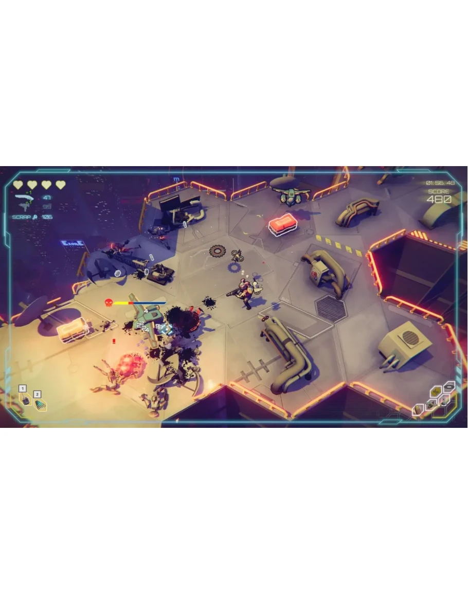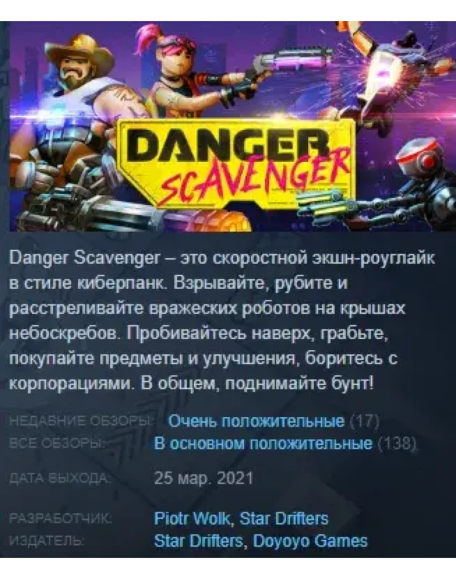 Danger Scavenger – это скоростной экшн-роуглайк в стиле киберпанк. Взрывайте, рубите и расстреливайте вражеских роботов на крышах небоскребов. Пробивайтесь наверх, грабьте, покупайте предметы и улучшения, боритесь с корпорациями. В общем, поднимайте бунт!