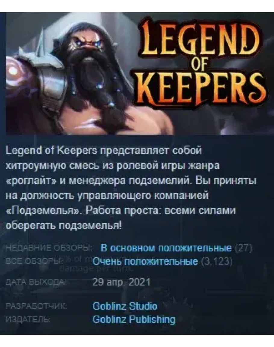 Legend of Keepers представляет собой хитроумную смесь из ролевой игры жанра «роглайт» и менеджера подземелий. Вы приняты на должность управляющего компанией «Подземелья». Работа проста: всеми силами оберегать подземелья!