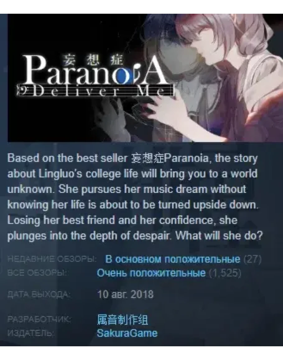 The game 'Paranoia: Deliver Me' is based on the novel 妄想症, or Paranoia, by Yuli. It is an ADV game about youth and school. The story is about a girl named Lingluo, who is trying her best to pursue her dreams of music. She lost her best friend, her confidence, and then was locked inside her own mind. Will she manage to escape from her self-made prison to reunite with her best friend and rebuild her dreams? Or will she remain trapped in her own mind?