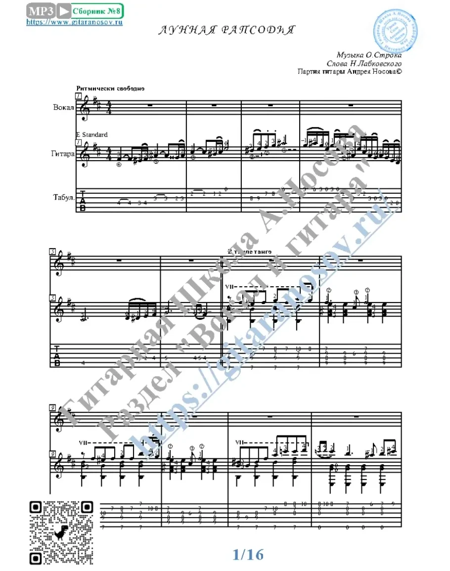 Товар состоит из двух частей (в одном PDF): 1 – Вокальная партия + гитарная партия с табулатурой; 2 – Вокальная партия + гитарная партия без табулатуры. Прилагается ссылка на прослушивание / скачивание mp3.
