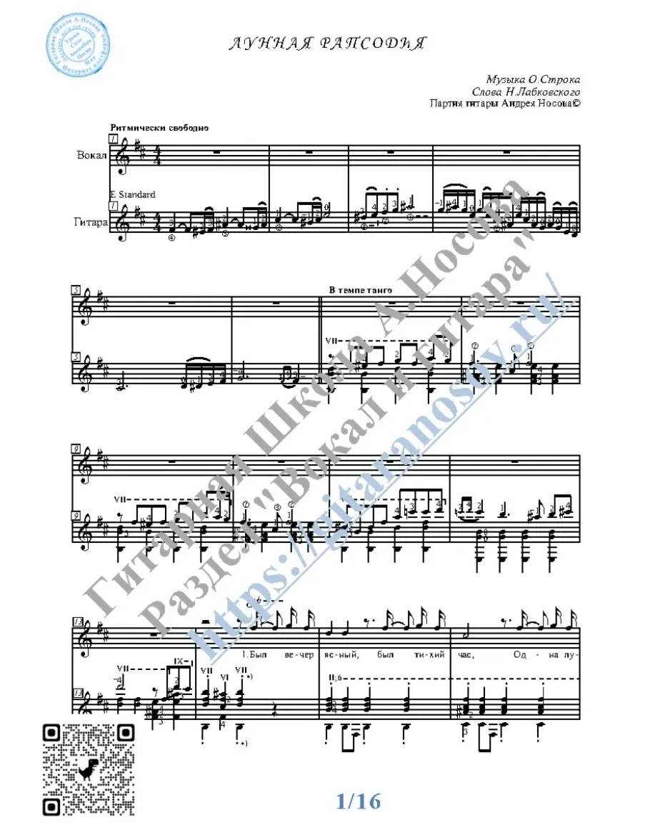 Кликните "Подробнее" для получения дополнительной информацииВашему вниманию предлагается композиция "Лунная рапсодия (муз.О.Строка, сл.Н.Лабковского)", предназначенная для вокала в сопровождении 6-ти струнной гитары. Запись выполнена нотами и включает в себя партию вокала с подтекстовкой, партию гитары с подробнейшей аппликатурой и текст песни (НА РУССКОМ).