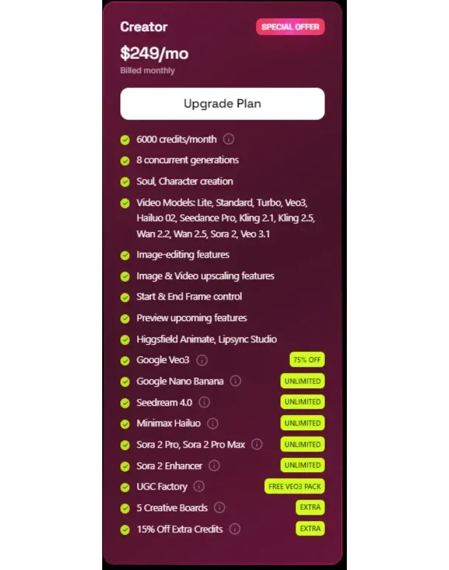Превратите свои идеи в реальность с HIGGSFIELD, платформой нового поколения для создания видео с ИИ. Выберите план, который идеально соответствует вашим творческим потребностям!
