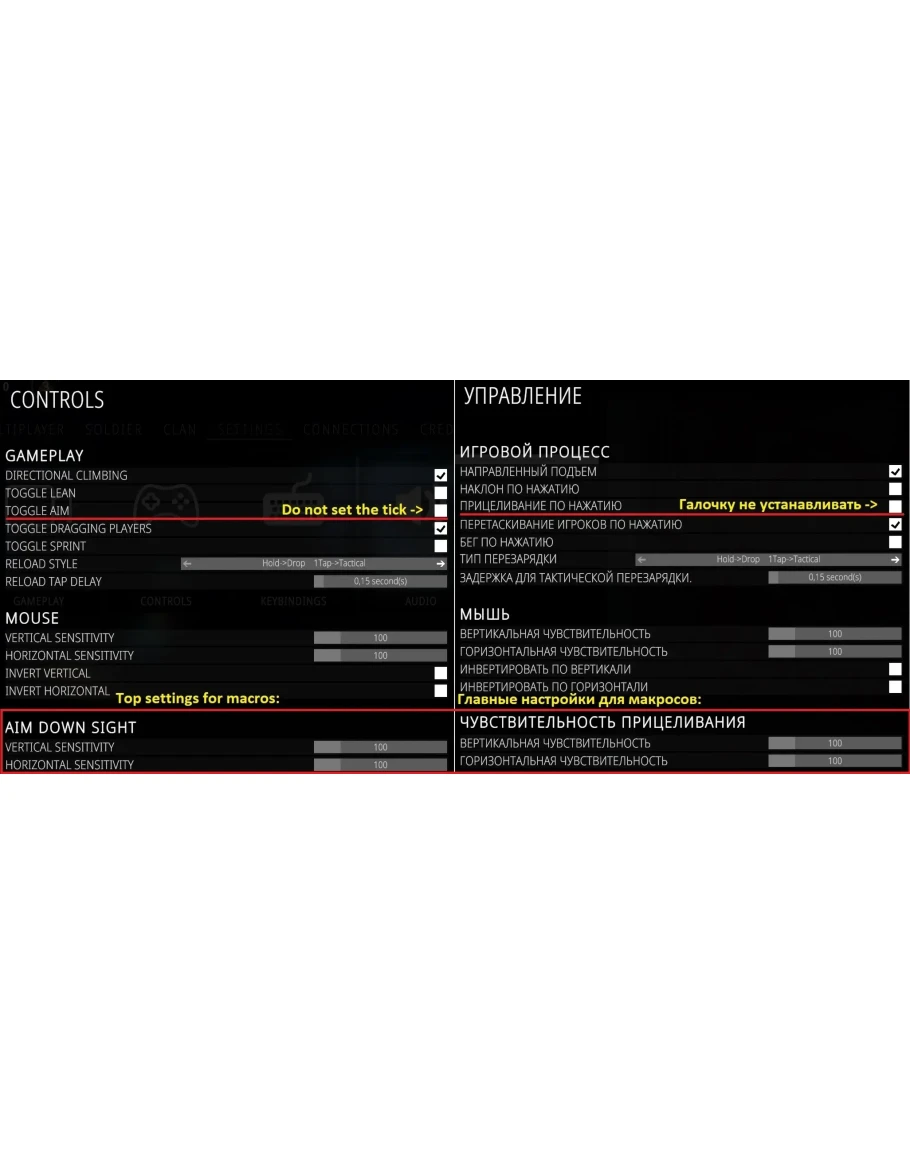 Макросы были написаны под оружие без модулей, под настройки чувствительности мыши в игре (прицеливание) — 100, FOV — 90.