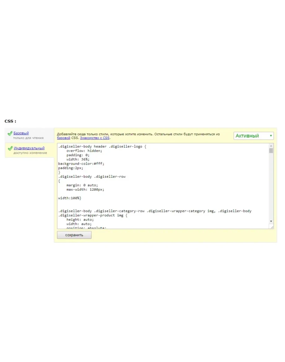 Внимание!Возможно что часть файла обрежится при вставке,это связанно с тем что для некоторых пользователей лимит индивидуального CSS остался на старом уровне(16 kb),обратитесь в службу поддержки DigiSeller c просьбой поднять лимит.Для начала можно попробовать вставить тестовый файл(любой текстовый файл размером 25-50 кб) и проверить обрежится ли он после сохранения.