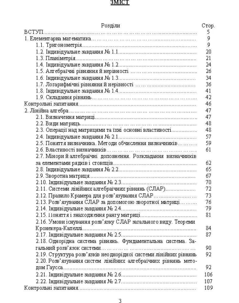 II. ЛІНІЙНА АЛГЕБРА: Операції над матрицями, Властивості визначників, Мінори й алгебраїчні доповнення, Системи лінійних алгебраїчних рівнянь (СЛАР), Правило Крамера, Розв’язування СЛАР за допомогою зворотної матриці, Поняття і знаходження рангу матриці, Умови існування розв’язку СЛАР загального виду, Теореми, Кронекера-Капеллі, Однорідна система рівнянь, Фундаментальна система, Загальний розв’язок системи, Розв’язування систем лінійних алгебраїчних рівнянь методом Гаусса