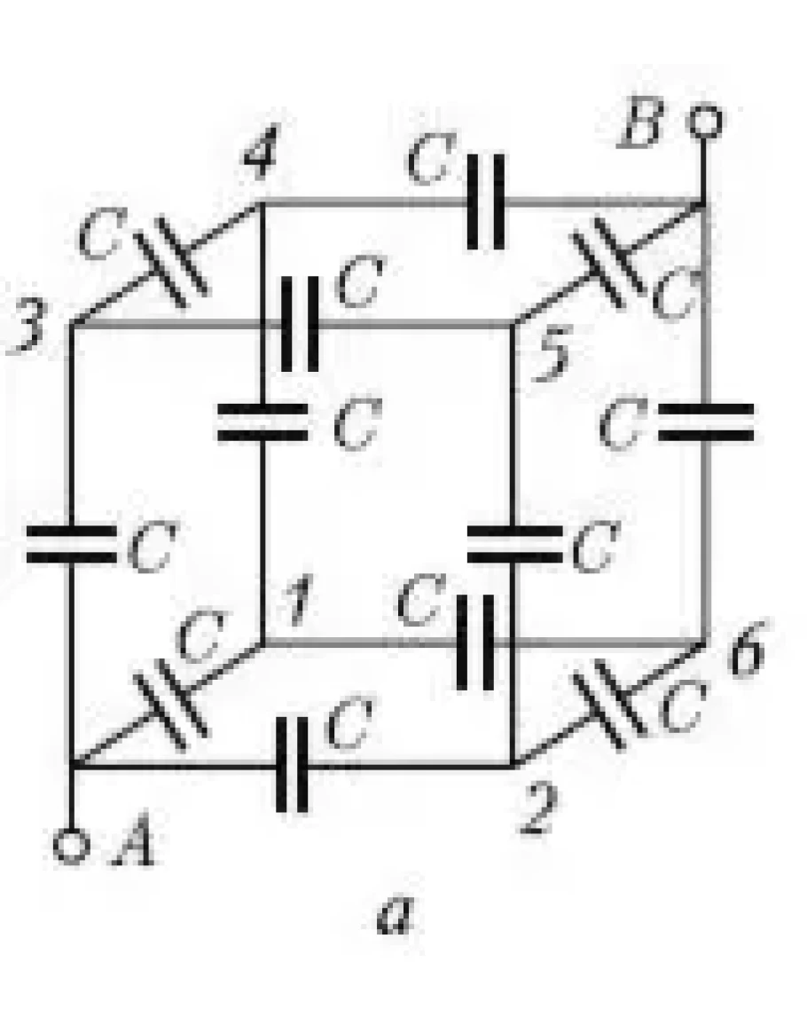 100. В каждое ребро куба, изготовленного из проволоки (рис. а), включены по одному конденсатору емкостью С каждый. Определите емкость этой батареи конденсаторов, если она включается в цепь проводниками, подсоединенными к противоположным концам (А и В) диагонали куба.