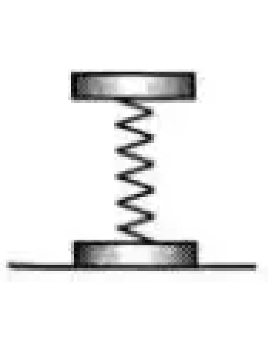 38. Система состоит из двух одинаковых цилиндров, каждый массы m, между которыми находится сжатая невесомая пружина жесткости k (рис.) Цилиндры связаны нитью, которую в некоторый момент пережигают. При каких значениях Δl - начальном сжатии пружины – нижний цилиндр подскочит после пережигания нити?