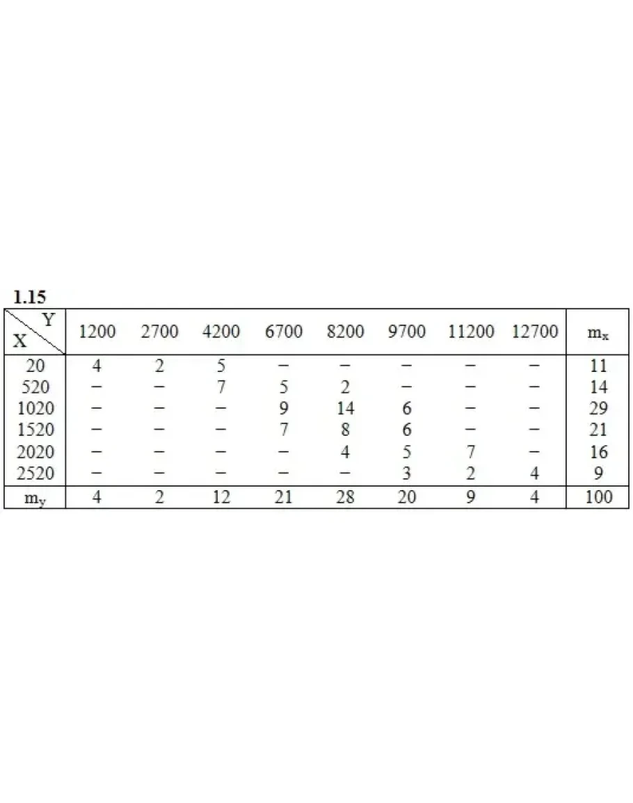 Дана таблица распределения 100 заводов по производственным средствам X(тыс. ден. ед.) и по суточной выработке Y(т). Известно, что между X и Y существует линейная корреляционная зависимость. Требуется: