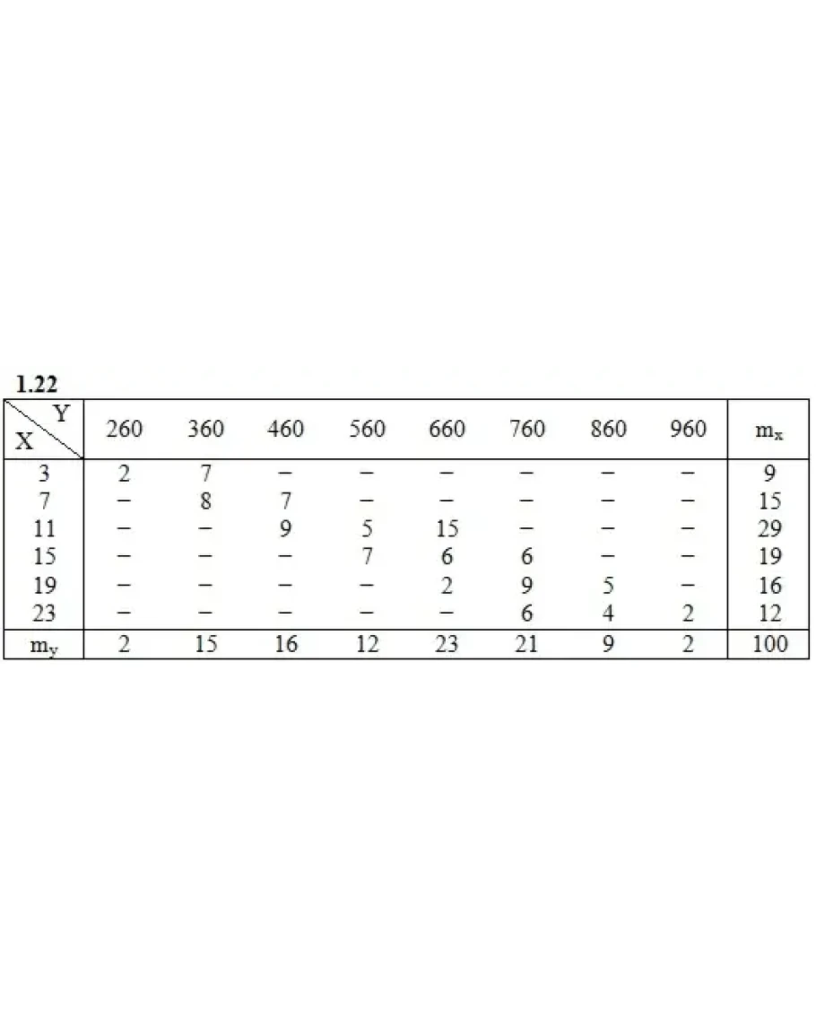 Дана таблица распределения 100 заводов по производственным средствам X(тыс. ден. ед.) и по суточной выработке Y(т). Известно, что между X и Y существует линейная корреляционная зависимость. Требуется: