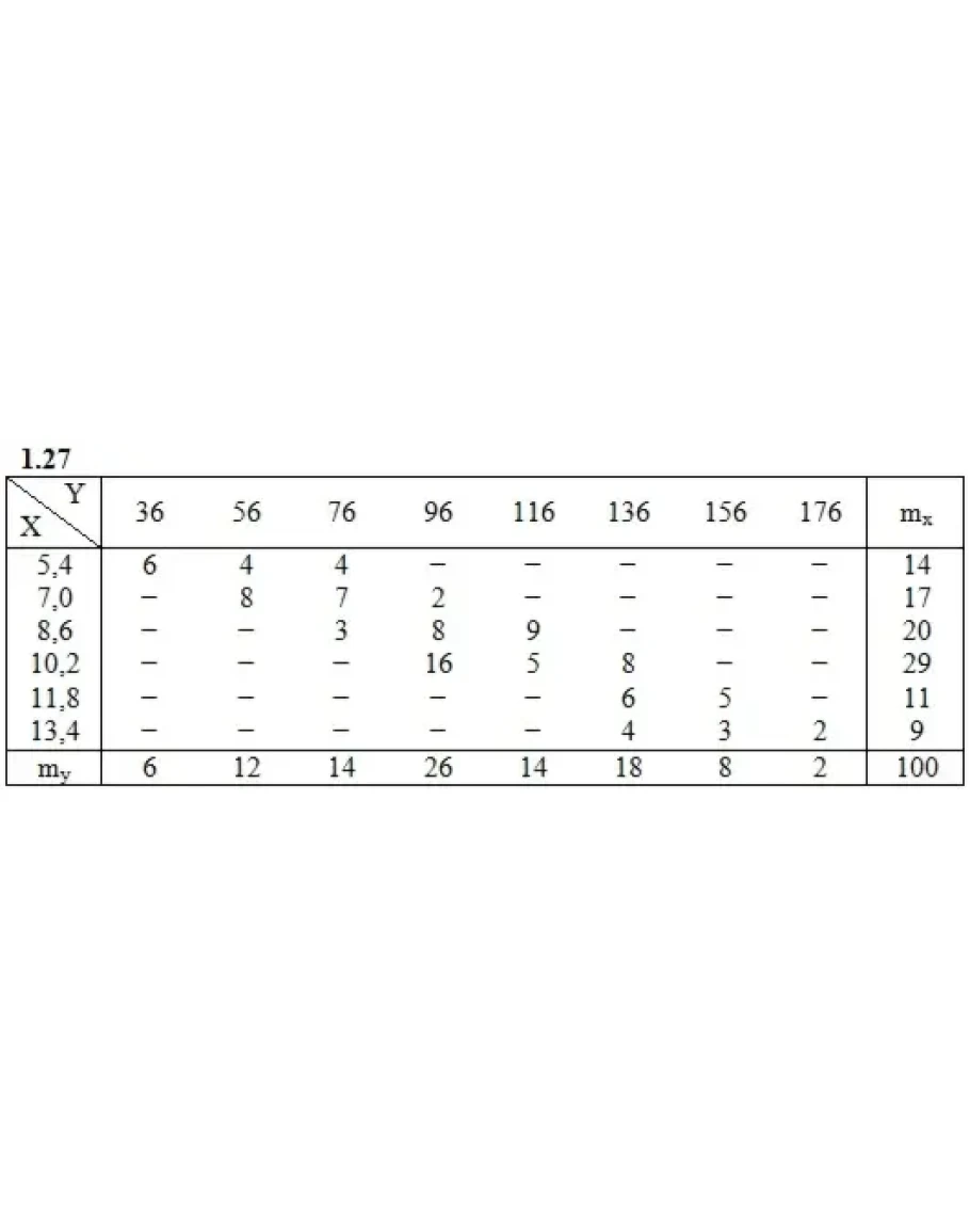 Дана таблица распределения 100 заводов по производственным средствам X(тыс. ден. ед.) и по суточной выработке Y(т). Известно, что между X и Y существует линейная корреляционная зависимость. Требуется: