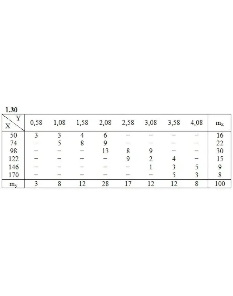 Дана таблица распределения 100 заводов по производственным средствам X(тыс. ден. ед.) и по суточной выработке Y(т). Известно, что между X и Y существует линейная корреляционная зависимость. Требуется: