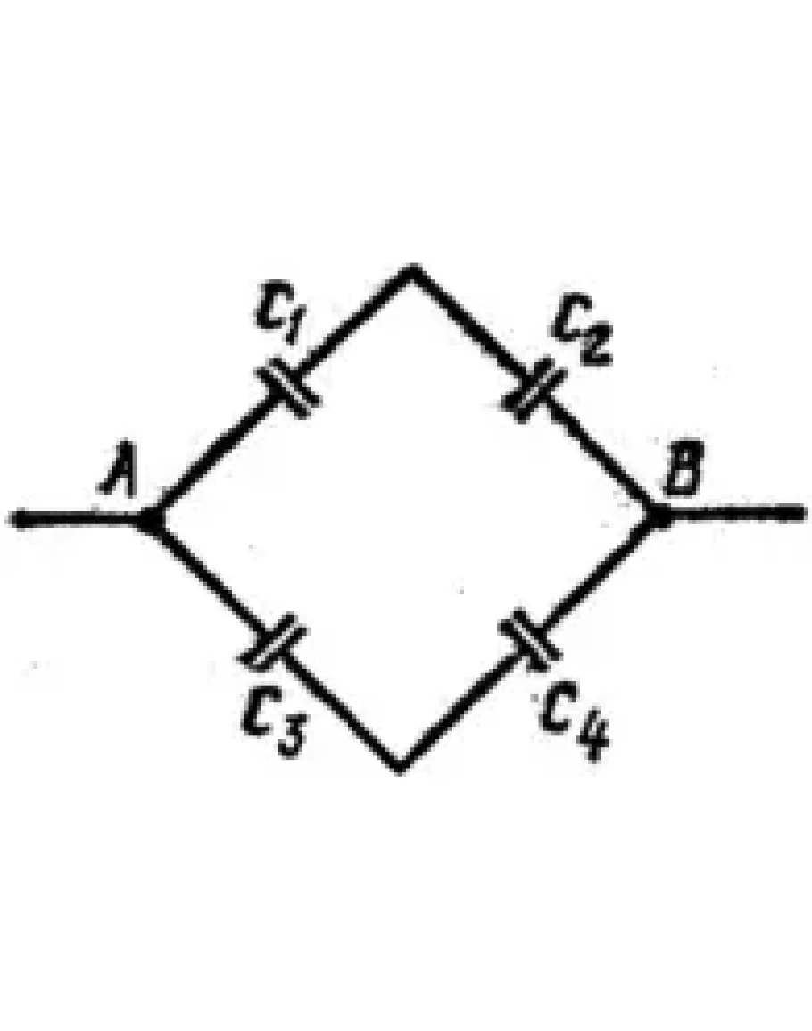 10. Конденсаторы электроемкостями C1=0,2 мкФ, С2=0,6 мкФ, С3=0,3 мкФ, С4=0,5 мкФ соединены так, как это указано на рис.. Разность потенциалов U между точками А и В равна 320 В. Определить разность потенциалов Ui и заряд Qi на пластинах каждого конденсатора (i=1, 2, 3, 4).