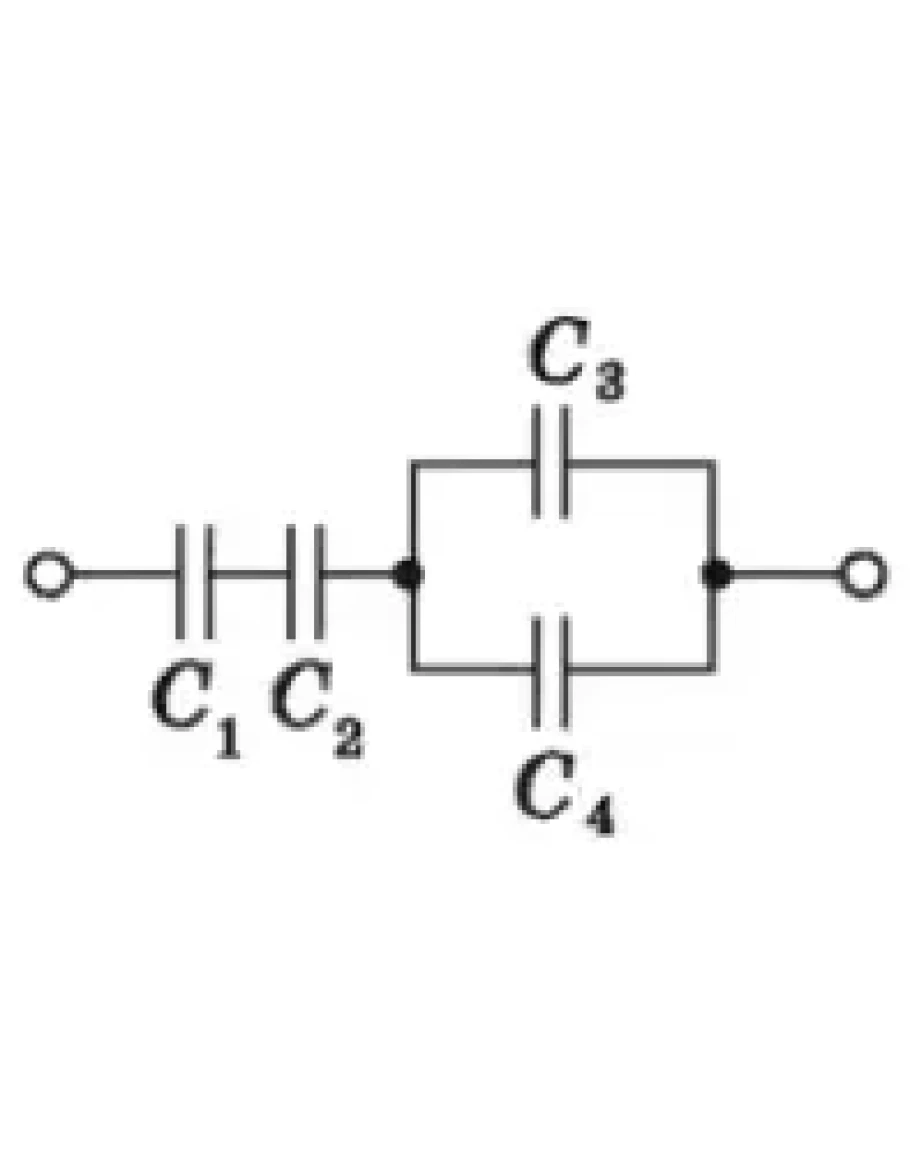 11. Определить электрическую ёмкость батареи конденсаторов, если конденсаторы имеют одинаковую ёмкость, равную 0,6 мкФ.
