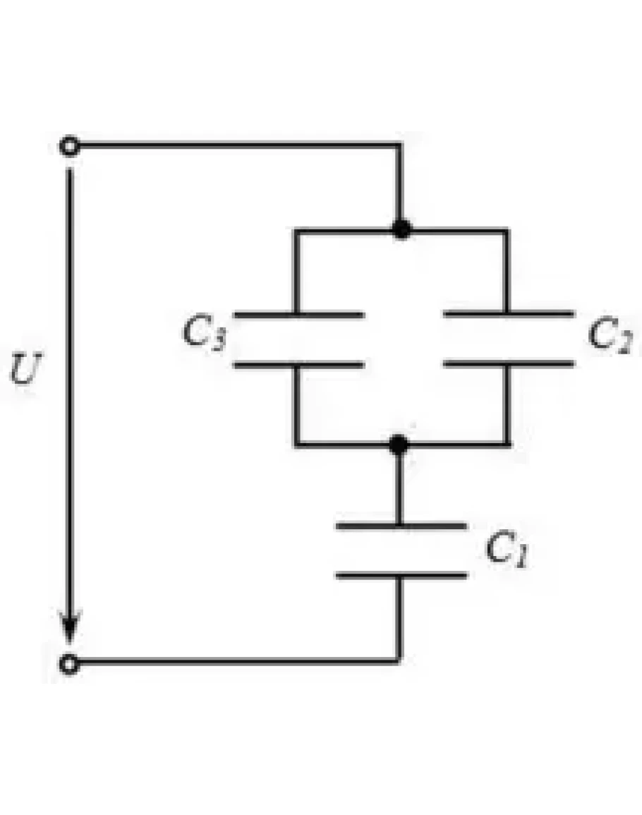 2. Какова эквивалентная емкость батареи конденсаторов на рисунке если С1 = 40 мкФ, С2 = 20 мкФ, С3 = 20 мкФ?