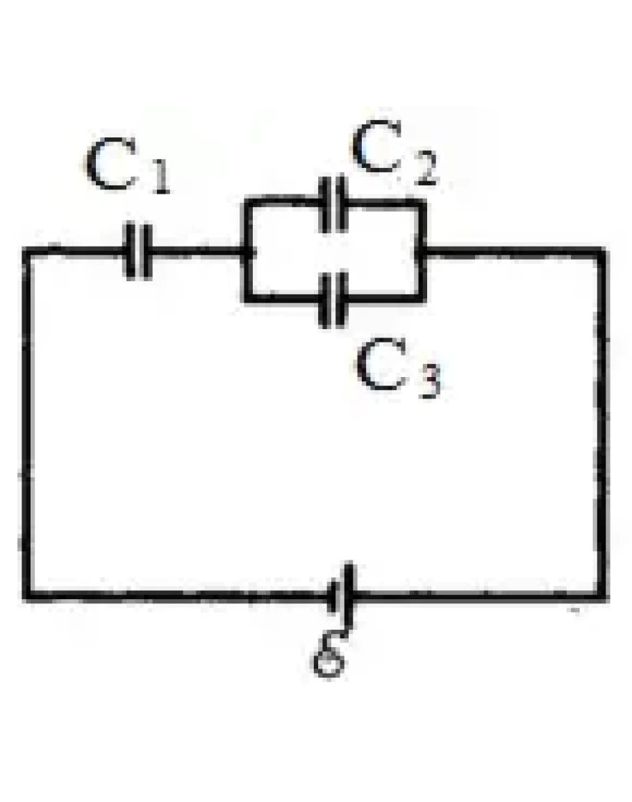 26. Определите заряды на каждом из конденсаторов в цепи, изображенной на рисунке, если C1 = 2 мкФ, С2 = 4 мкФ, С3 = 6 мкФ, ε = 18 В.