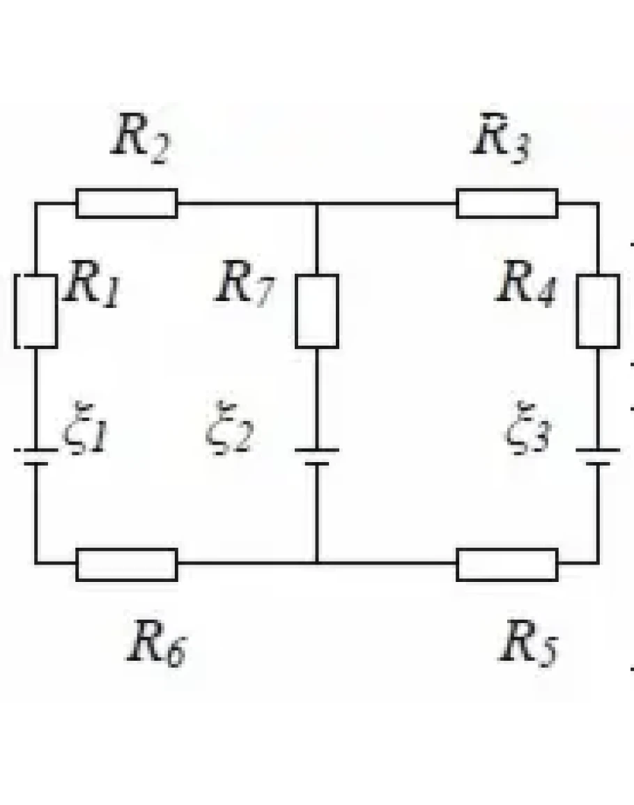 92. В схеме, изображенной на рисунке, ξ1 = 10 В, ξ2 =20 В, ξ3 = 30 В, R1 =1 Ом, R2 = 2 Ом, R3 = 2 Ом, R4= 4 Ом, R5 =5 Ом, R6 =6 Ом, R7 = 7 Ом. Внутренние сопротивления источников малы. Найти силы токов.