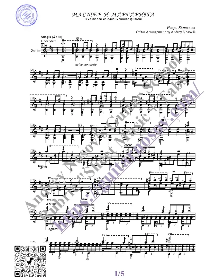 Кликните "Подробнее" для получения дополнительной информацииВашему вниманию предлагается композиция "Мастер и Маргарита, тема любви (И.Корнелюк)", предназначенная для исполнения на 6-ти струнной гитаре СОЛО. Запись выполнена нотами, сопровождена подробнейшей аппликатурой и продублирована табулатурой.