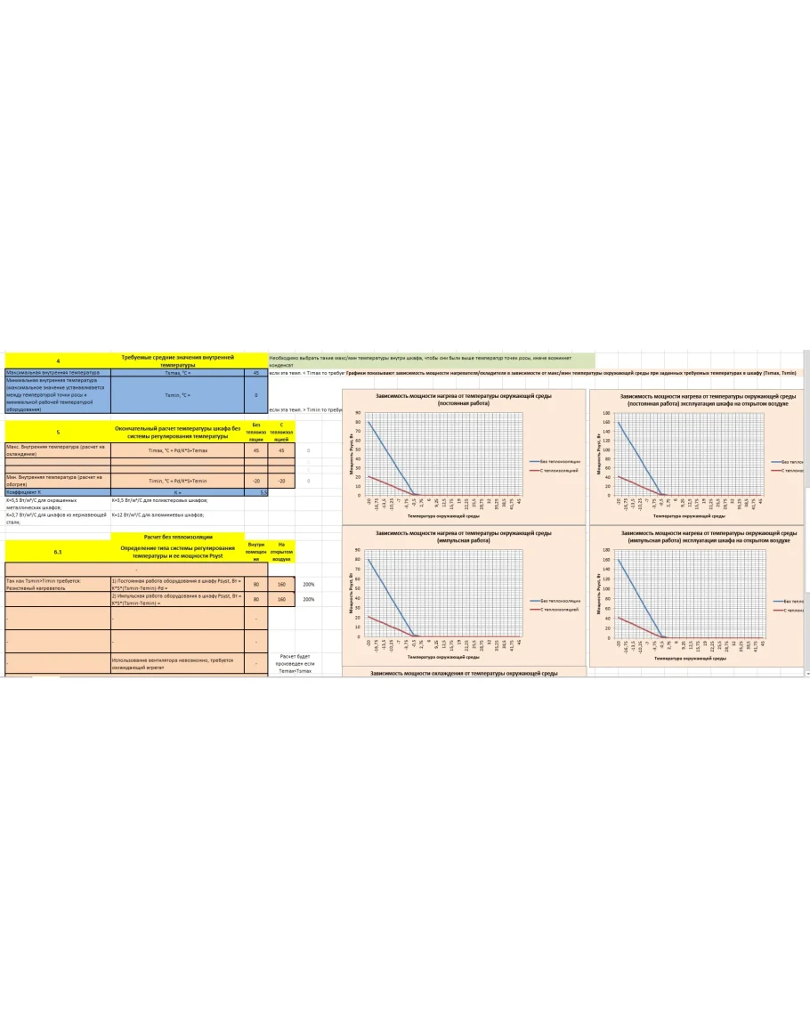 В расчете учитывается местоположение шкафа, материал из которого он изготовлен, мощность тепла выделяемая оборудованием внутри шкафа, требуемая температура внутри шкафа и диапазон наружных температур, наличие теплоизоляции шкафа.