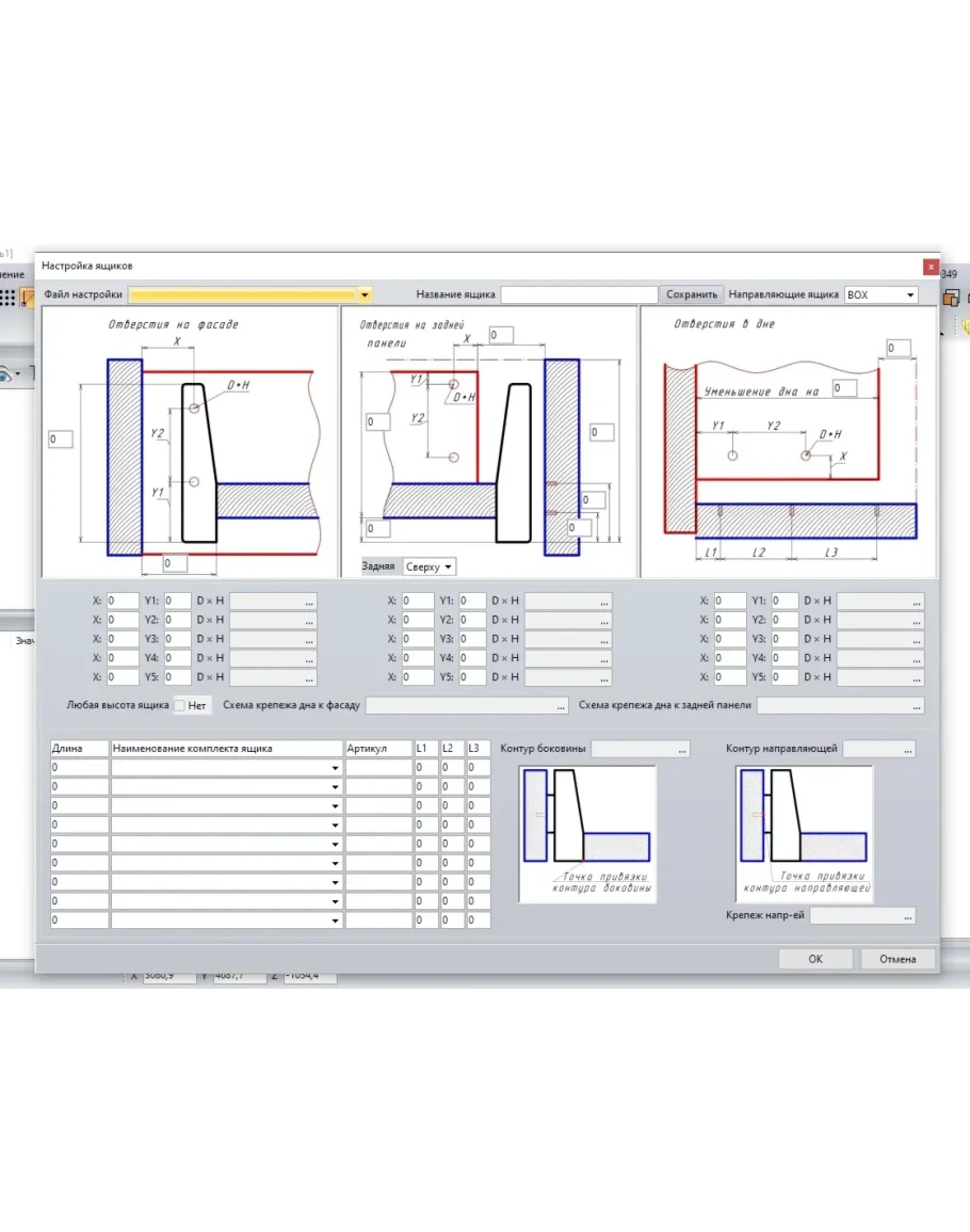 Скрипт Ящик для Базис мебельщик. Работает в версиях 10-22. Перед приобретением скачать https://drive.google.com/file/d/1SvoucANrJHxaGZJghN2fhdL9PX-6c-sR/view?usp=sharing и после заменить файл Ящик10-22.js. Установка ящиков по двум точкам. Дополнительно скрипт настройки ящиков для установки параметров, крепежа и прочее.