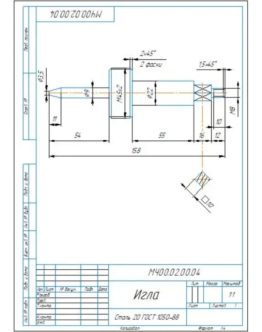 Рабочий чертеж детали игла МЧ00.02.00.04 в программе Компас 3D из сборки МЧ00.02.00.00 выключатель подачи топлива из сборника по деталированию Боголюбова