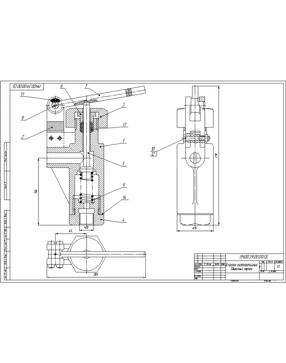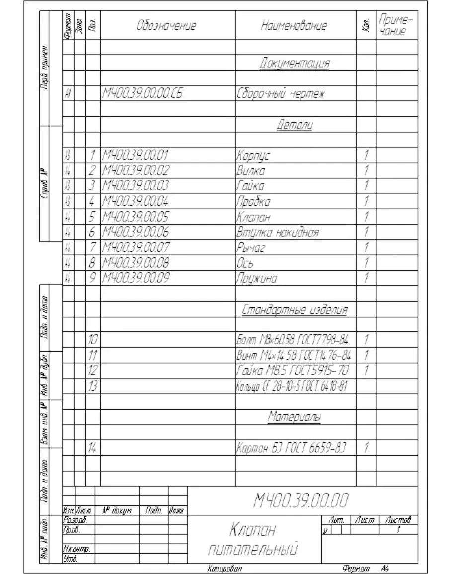 Сборка "Клапан питательный" с С.К. Боголюбов "Чтение и деталирование сборочных чертежей" Альбом Издательство "Машиностроение" Москва 1986 г. Шифр сборочной единицы МЧ00.39.00.00.СБ.