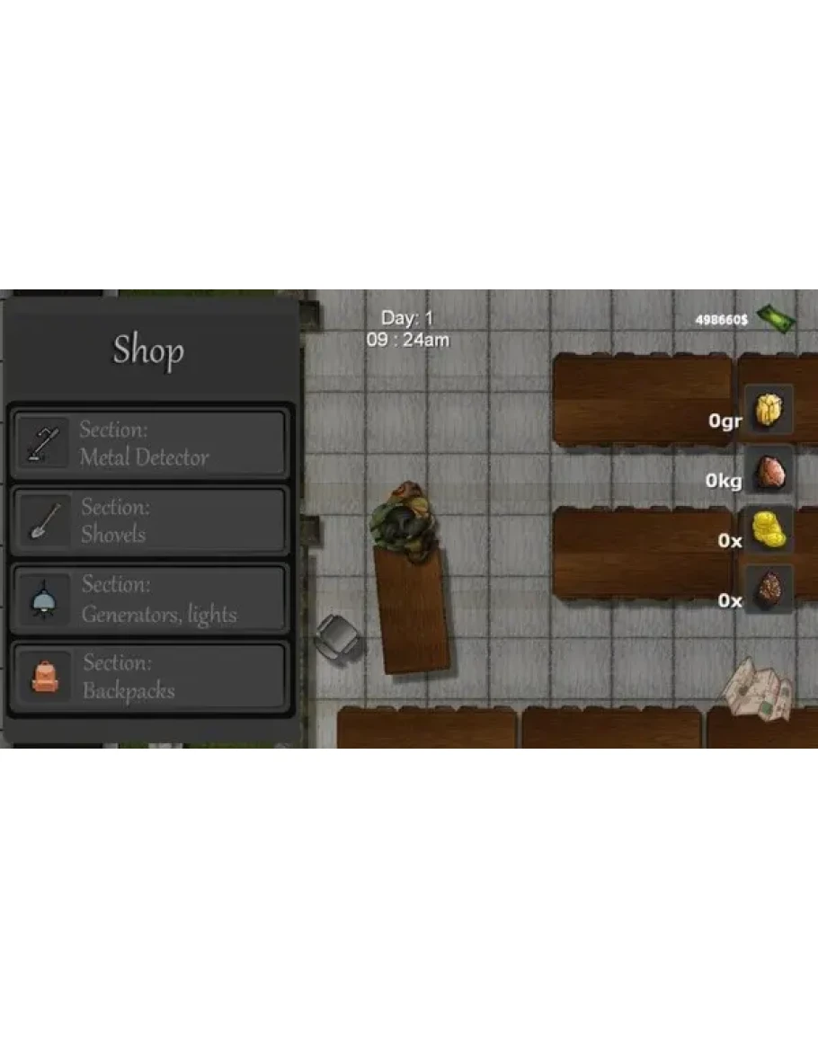 2D- платформер с видом с верху. В игре вам предстоит покупать снаряжение для поисков различных предметов. Металлоискатели, лопаты, помогут вам в этом. Вы приезжаете на новые земли, вам нужно купить землю и начать поиск золота и монет, так же вам будет попадаться хлам. Все эти вещи вы сможете продавать в местном магазине. Есть так же не дорогой отель, в котором вы сможете отдохнуть. Есть не большой магазин с инструментом. Ваша заача найти уникальный артефакт и стать самым популярным кладоискателем.