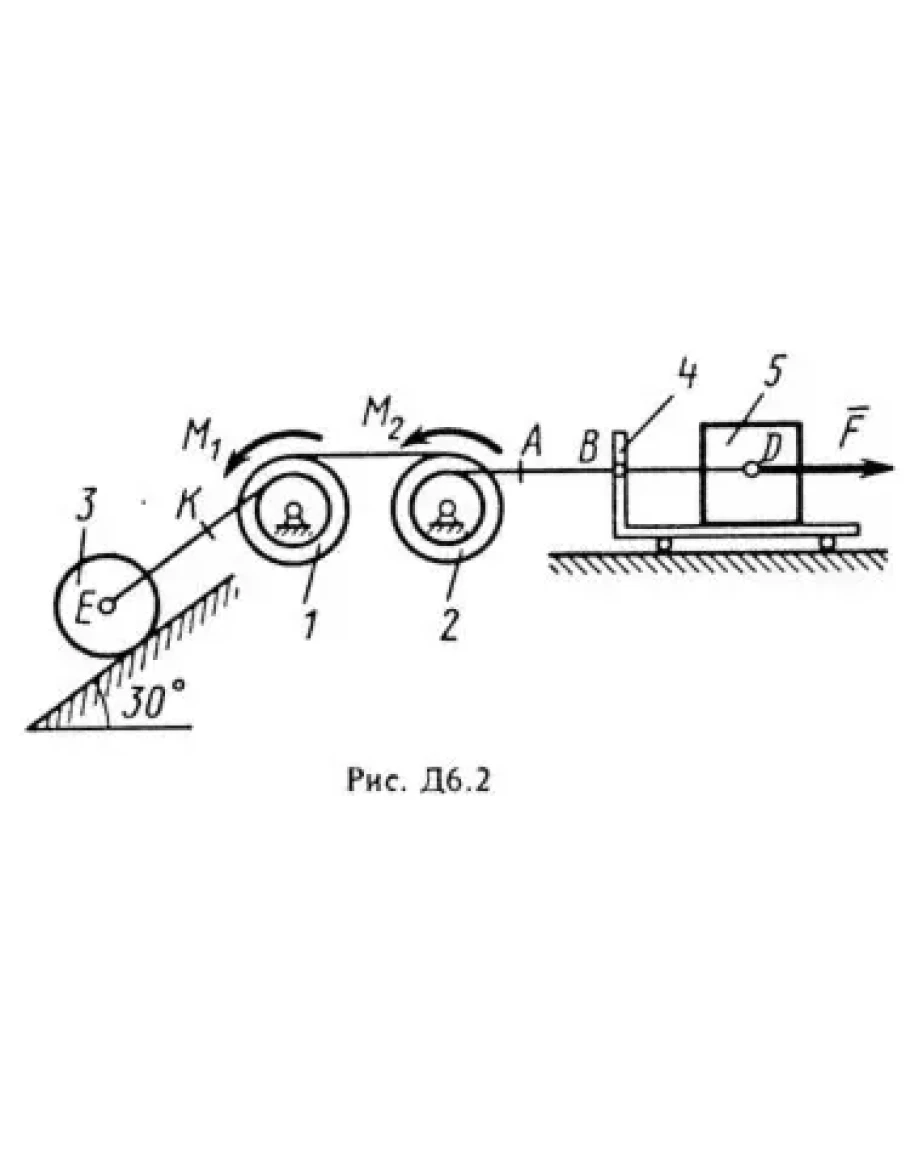 На систему кроме сил тяжести действуют сила F, приложенная к телу 4 или 5 (если тело 5 в систему не входит, сила приложена в точке В к тележке), и пары сил с моментами М1 и М2, приложенные к блокам (при М < 0 направление момента противоположно показанному на рисунке).