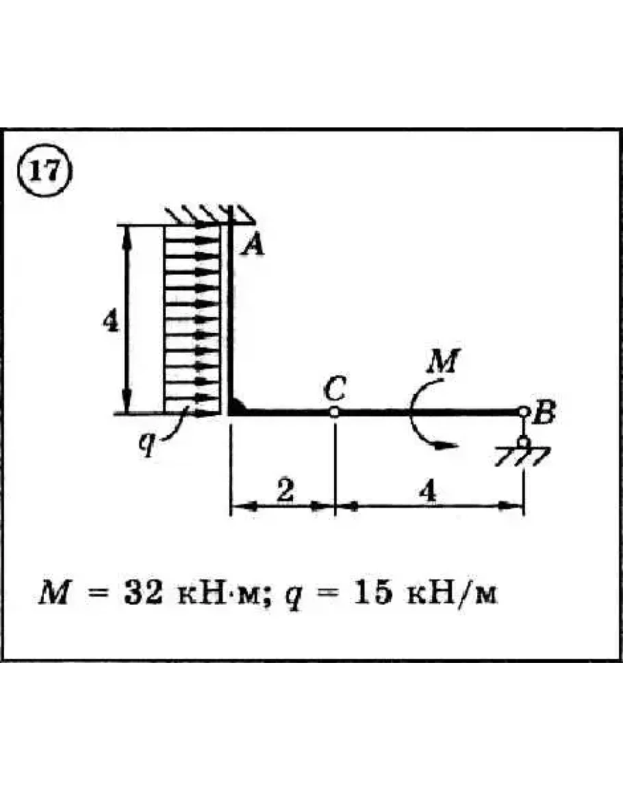 Для представленной на схеме составной конструкции найти реакции опор используя принцип возможных скоростей или принцип возможных перемещений Лагранжа. Размеры указаны в метрах. Весом элементов конструкции пренебречь.