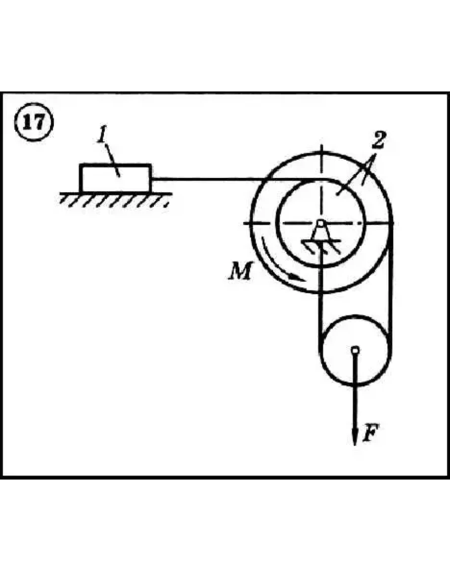 Для представленной на рисунке схеме используя принцип Лагранжа, определить величину силы F (при наличии трения - максимальное значение этой величины), при которой механическая система будет находиться в равновесии. Исходные данные: вес груза G = 20 кН, вращающий момент M = 1 кНм, радиус барабана R2 = 0,4м (у двойного барабана имеется также r2 = 0,2м), угол α = 300 и коэффициент трения скольжения f = 0,5. Ненумерованные блоки и катки считать невесомыми. Трением на осях барабана и блоков пренебречь.