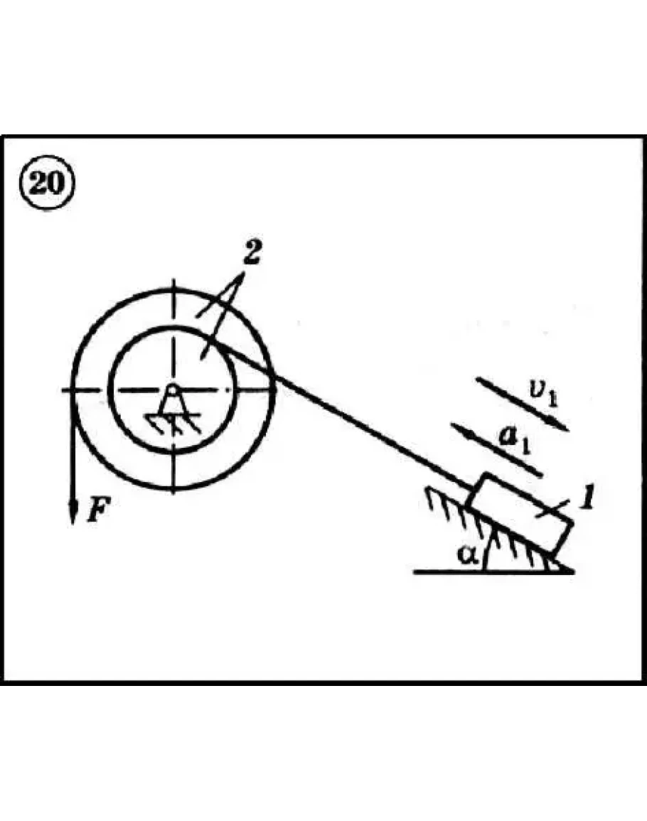 Для приведенной на схеме механической системы, используя принцип Даламбера, определить величину силы F, необходимую для перемещения груза с заданным ускорением a1, а также усилие в грузовом тросе. Исходные данные: массы груза m1 и барабана m2, радиус барабана R2 (у двойного барабана имеется также r2), его радиус инерции ρ2 (если он не задан, тело считать однородным цилиндром), угол α и коэффициент трения скольжения f приведены в таблице. Непронумерованные блоки и катки считать невесомыми. Трением на осях барабана и блоков пренебречь.