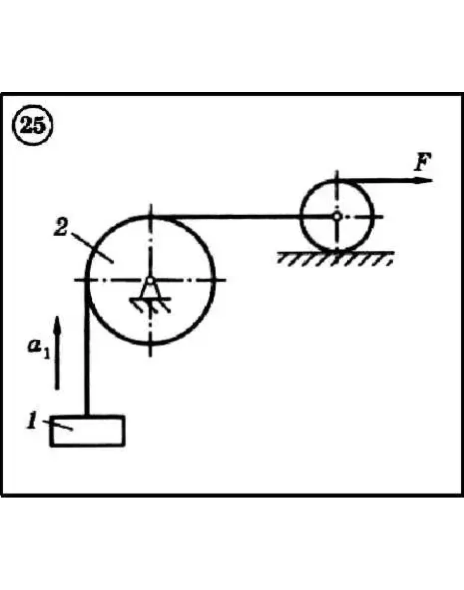 Для приведенной на схеме механической системы, используя принцип Даламбера, определить величину силы F, необходимую для перемещения груза с заданным ускорением a1, а также усилие в грузовом тросе. Исходные данные: массы груза m1 и барабана m2, радиус барабана R2 (у двойного барабана имеется также r2), его радиус инерции ρ2 (если он не задан, тело считать однородным цилиндром), угол α и коэффициент трения скольжения f приведены в таблице. Непронумерованные блоки и катки считать невесомыми. Трением на осях барабана и блоков пренебречь.