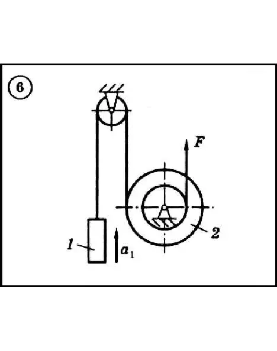 Для приведенной на схеме механической системы, используя принцип Даламбера, определить величину силы F, необходимую для перемещения груза с заданным ускорением a1, а также усилие в грузовом тросе. Исходные данные: массы груза m1 и барабана m2, радиус барабана R2 (у двойного барабана имеется также r2), его радиус инерции ρ2 (если он не задан, тело считать однородным цилиндром), угол α и коэффициент трения скольжения f приведены в таблице. Непронумерованные блоки и катки считать невесомыми. Трением на осях барабана и блоков пренебречь.