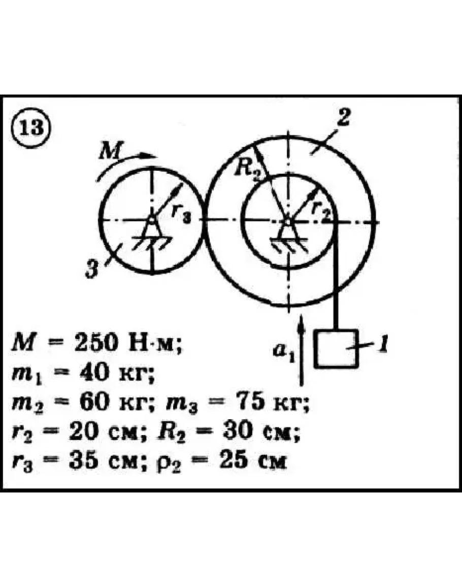 Для приведенной на схеме механической системы, используя уравнения Лагранжа второго рода, определить указанное на схеме угловое ускорение или линейное ускорение. Нити невесомы и нерастяжимы. Принятые обозначения: m - массы тел, R и r - радиусы, ρ - радиус инерции (если он не указан, тело считать однородным цилиндром); при наличии трения указываются: f - коэффициент трения скольжения, fk - коэффициент трения качения.