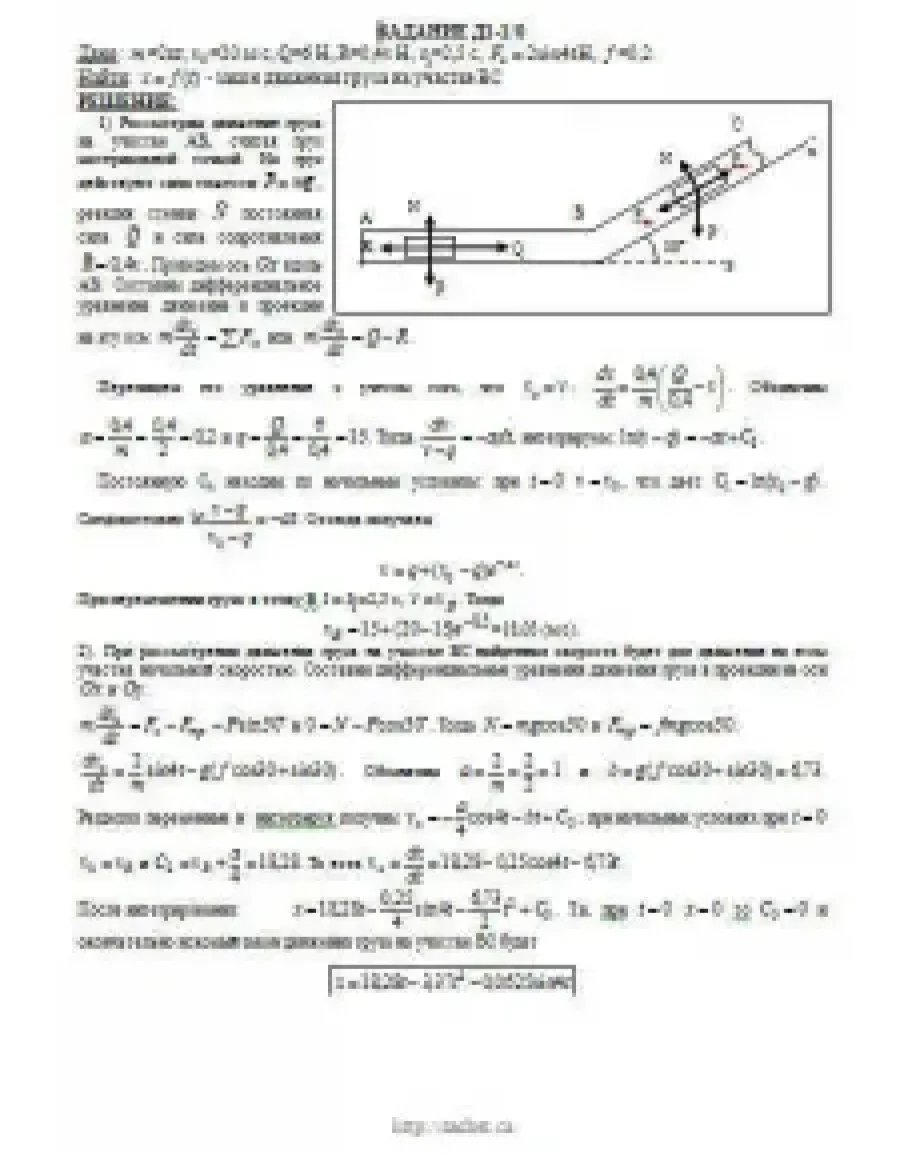 Груз D массой m, получив в точке A начальную скорость v0 движется в изогнутой трубе AВС, расположенной в вертикальной плоскости; участки трубы или оба наклонные, или один горизонтальный, а другой наклонный (рис. Д1.0 — Д1.9, табл. Д1). На участке AВ на груз кроме силы тяжести действуют постоянная сила Q (ее направление показано на рисунках) и сила сопротивления среды R, зависящая от скорости v груза (направлена против движения); трением груза о трубу на участке AВ пренебречь. В точке В груз, не изменяя своей скорости, переходит на участок ВС трубы, где на него кроме силы тяжести действуют сила трения (коэффициент трения груза о трубу f = 0,2) и переменная сила F, проекция которой Fx на ось х задана в таблице. Считая груз материальной точкой и зная расстояние AВ = l или время t1 движения груза от точки А до точки В, найти закон движения груза на участке ВС, т. е. х = f(t), где х = BD.