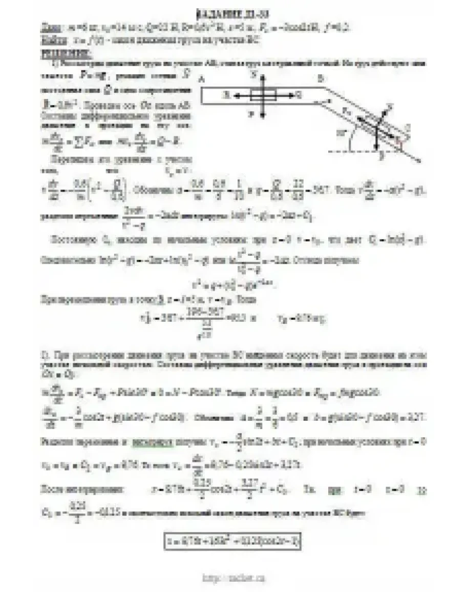 Груз D массой m, получив в точке A начальную скорость v0 движется в изогнутой трубе AВС, расположенной в вертикальной плоскости; участки трубы или оба наклонные, или один горизонтальный, а другой наклонный (рис. Д1.0 — Д1.9, табл. Д1). На участке AВ на груз кроме силы тяжести действуют постоянная сила Q (ее направление показано на рисунках) и сила сопротивления среды R, зависящая от скорости v груза (направлена против движения); трением груза о трубу на участке AВ пренебречь. В точке В груз, не изменяя своей скорости, переходит на участок ВС трубы, где на него кроме силы тяжести действуют сила трения (коэффициент трения груза о трубу f = 0,2) и переменная сила F, проекция которой Fx на ось х задана в таблице. Считая груз материальной точкой и зная расстояние AВ = l или время t1 движения груза от точки А до точки В, найти закон движения груза на участке ВС, т. е. х = f(t), где х = BD.