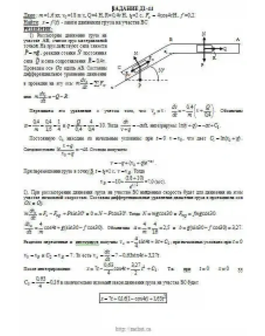 Груз D массой m, получив в точке A начальную скорость v0 движется в изогнутой трубе AВС, расположенной в вертикальной плоскости; участки трубы или оба наклонные, или один горизонтальный, а другой наклонный (рис. Д1.0 — Д1.9, табл. Д1). На участке AВ на груз кроме силы тяжести действуют постоянная сила Q (ее направление показано на рисунках) и сила сопротивления среды R, зависящая от скорости v груза (направлена против движения); трением груза о трубу на участке AВ пренебречь. В точке В груз, не изменяя своей скорости, переходит на участок ВС трубы, где на него кроме силы тяжести действуют сила трения (коэффициент трения груза о трубу f = 0,2) и переменная сила F, проекция которой Fx на ось х задана в таблице. Считая груз материальной точкой и зная расстояние AВ = l или время t1 движения груза от точки А до точки В, найти закон движения груза на участке ВС, т. е. х = f(t), где х = BD.