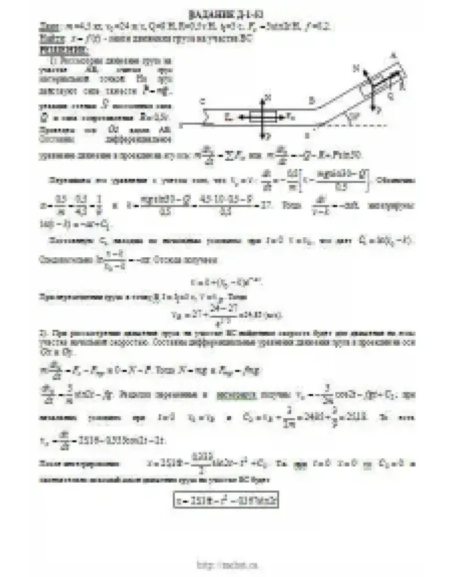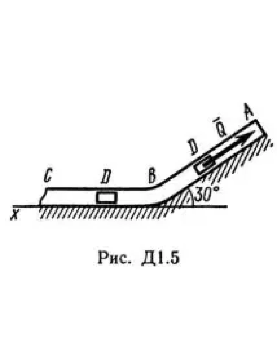 Груз D массой m, получив в точке A начальную скорость v0 движется в изогнутой трубе AВС, расположенной в вертикальной плоскости; участки трубы или оба наклонные, или один горизонтальный, а другой наклонный (рис. Д1.0 — Д1.9, табл. Д1). На участке AВ на груз кроме силы тяжести действуют постоянная сила Q (ее направление показано на рисунках) и сила сопротивления среды R, зависящая от скорости v груза (направлена против движения); трением груза о трубу на участке AВ пренебречь. В точке В груз, не изменяя своей скорости, переходит на участок ВС трубы, где на него кроме силы тяжести действуют сила трения (коэффициент трения груза о трубу f = 0,2) и переменная сила F, проекция которой Fx на ось х задана в таблице. Считая груз материальной точкой и зная расстояние AВ = l или время t1 движения груза от точки А до точки В, найти закон движения груза на участке ВС, т. е. х = f(t), где х = BD.