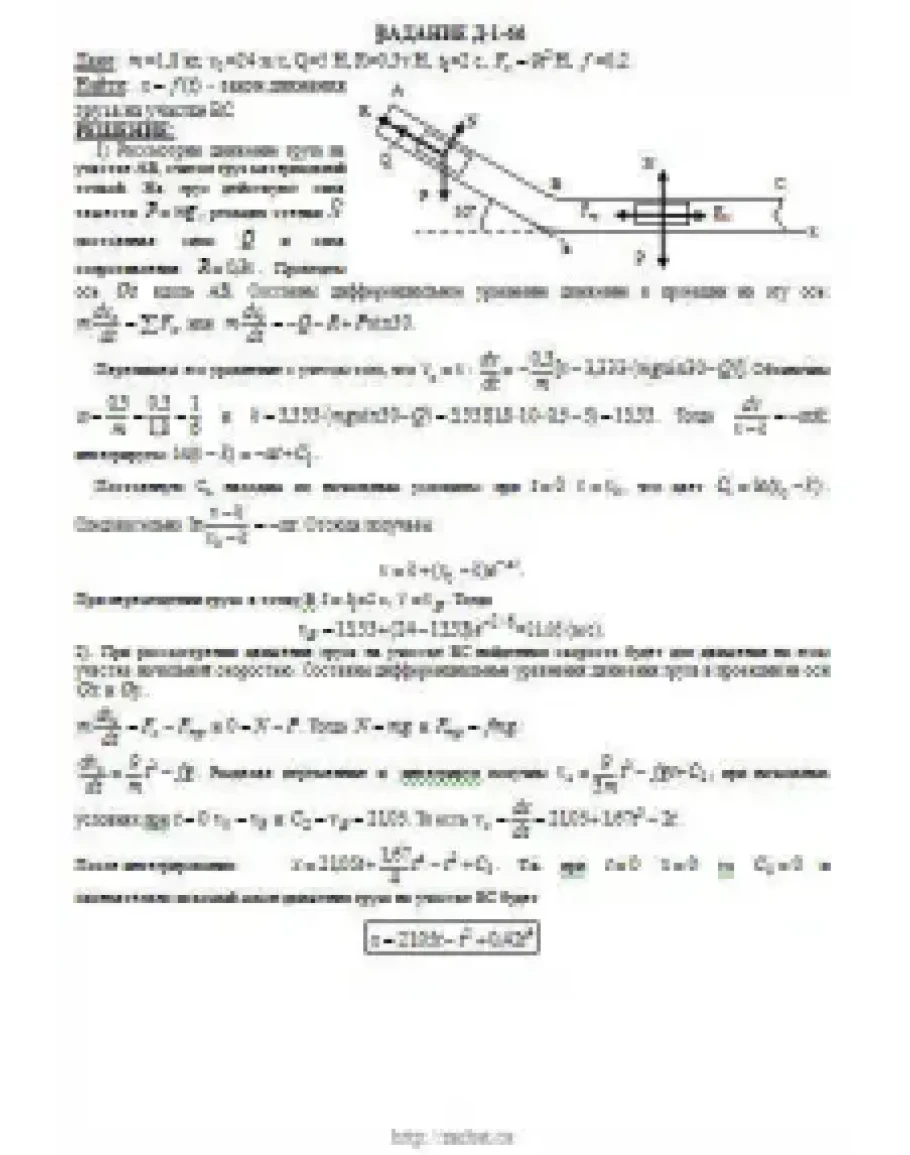 Груз D массой m, получив в точке A начальную скорость v0 движется в изогнутой трубе AВС, расположенной в вертикальной плоскости; участки трубы или оба наклонные, или один горизонтальный, а другой наклонный (рис. Д1.0 — Д1.9, табл. Д1). На участке AВ на груз кроме силы тяжести действуют постоянная сила Q (ее направление показано на рисунках) и сила сопротивления среды R, зависящая от скорости v груза (направлена против движения); трением груза о трубу на участке AВ пренебречь. В точке В груз, не изменяя своей скорости, переходит на участок ВС трубы, где на него кроме силы тяжести действуют сила трения (коэффициент трения груза о трубу f = 0,2) и переменная сила F, проекция которой Fx на ось х задана в таблице. Считая груз материальной точкой и зная расстояние AВ = l или время t1 движения груза от точки А до точки В, найти закон движения груза на участке ВС, т. е. х = f(t), где х = BD.