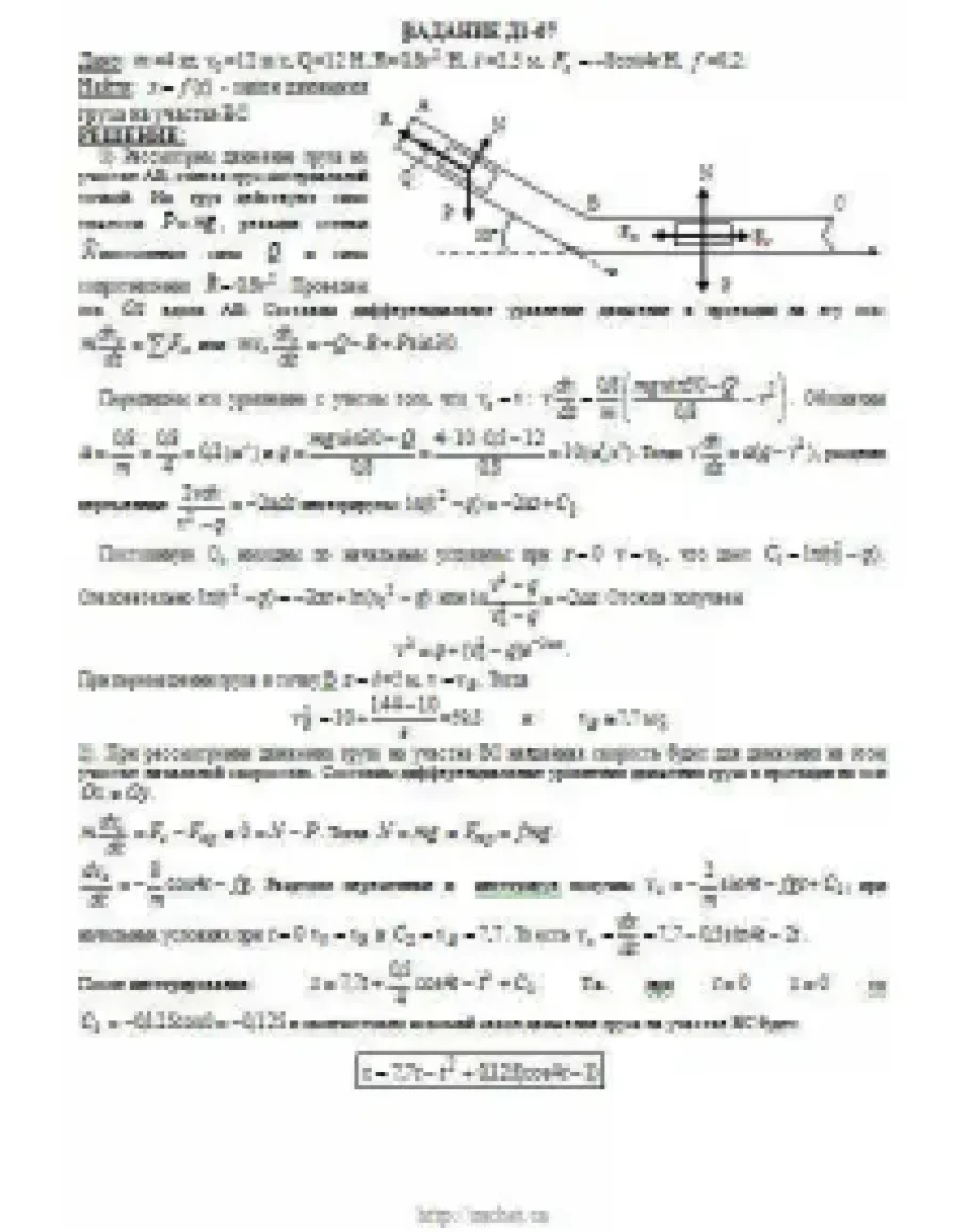 Груз D массой m, получив в точке A начальную скорость v0 движется в изогнутой трубе AВС, расположенной в вертикальной плоскости; участки трубы или оба наклонные, или один горизонтальный, а другой наклонный (рис. Д1.0 — Д1.9, табл. Д1). На участке AВ на груз кроме силы тяжести действуют постоянная сила Q (ее направление показано на рисунках) и сила сопротивления среды R, зависящая от скорости v груза (направлена против движения); трением груза о трубу на участке AВ пренебречь. В точке В груз, не изменяя своей скорости, переходит на участок ВС трубы, где на него кроме силы тяжести действуют сила трения (коэффициент трения груза о трубу f = 0,2) и переменная сила F, проекция которой Fx на ось х задана в таблице. Считая груз материальной точкой и зная расстояние AВ = l или время t1 движения груза от точки А до точки В, найти закон движения груза на участке ВС, т. е. х = f(t), где х = BD.