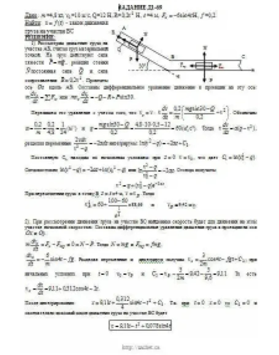Груз D массой m, получив в точке A начальную скорость v0 движется в изогнутой трубе AВС, расположенной в вертикальной плоскости; участки трубы или оба наклонные, или один горизонтальный, а другой наклонный (рис. Д1.0 — Д1.9, табл. Д1). На участке AВ на груз кроме силы тяжести действуют постоянная сила Q (ее направление показано на рисунках) и сила сопротивления среды R, зависящая от скорости v груза (направлена против движения); трением груза о трубу на участке AВ пренебречь. В точке В груз, не изменяя своей скорости, переходит на участок ВС трубы, где на него кроме силы тяжести действуют сила трения (коэффициент трения груза о трубу f = 0,2) и переменная сила F, проекция которой Fx на ось х задана в таблице. Считая груз материальной точкой и зная расстояние AВ = l или время t1 движения груза от точки А до точки В, найти закон движения груза на участке ВС, т. е. х = f(t), где х = BD.