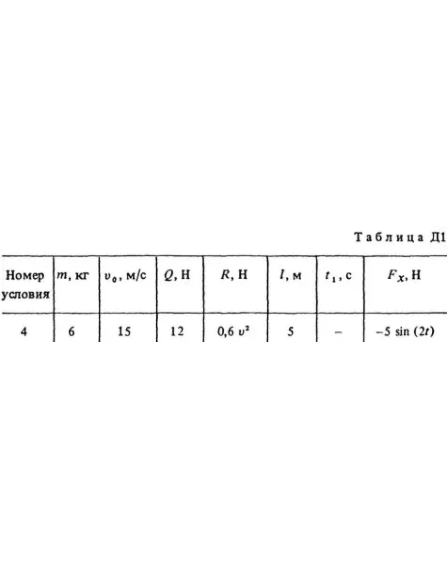 Груз D массой m, получив в точке А начальную скорость v0, движется в изогнутой трубе ABC, расположенной в вертикальной плоскости; участки трубы или оба наклонные, или один горизонтальный, а другой наклонный (рис. Д1.0-Д1.9 табл. Д1). На рисунке АВ на груз кроме силы тяжести действуют постоянная сила Q (ее направление показано на рисунках) и сила сопротивления среды R, зависит от скорости груза v (направлена против движения). В точке В груз, не изменяя значения своей скорости, переходит на участок ВС трубы, где на него кроме силы тяжести действует переменная сила F, проекция которой Fx на ось x задана в таблице. Считая груз материальной точкой и зная расстояние АВ = l или время t1 движения груза от точки А до точки В. Найти закон движения груза на участке ВС, т.е. x = f(t), где x = BD. Трением груза о трубу пренебречь.