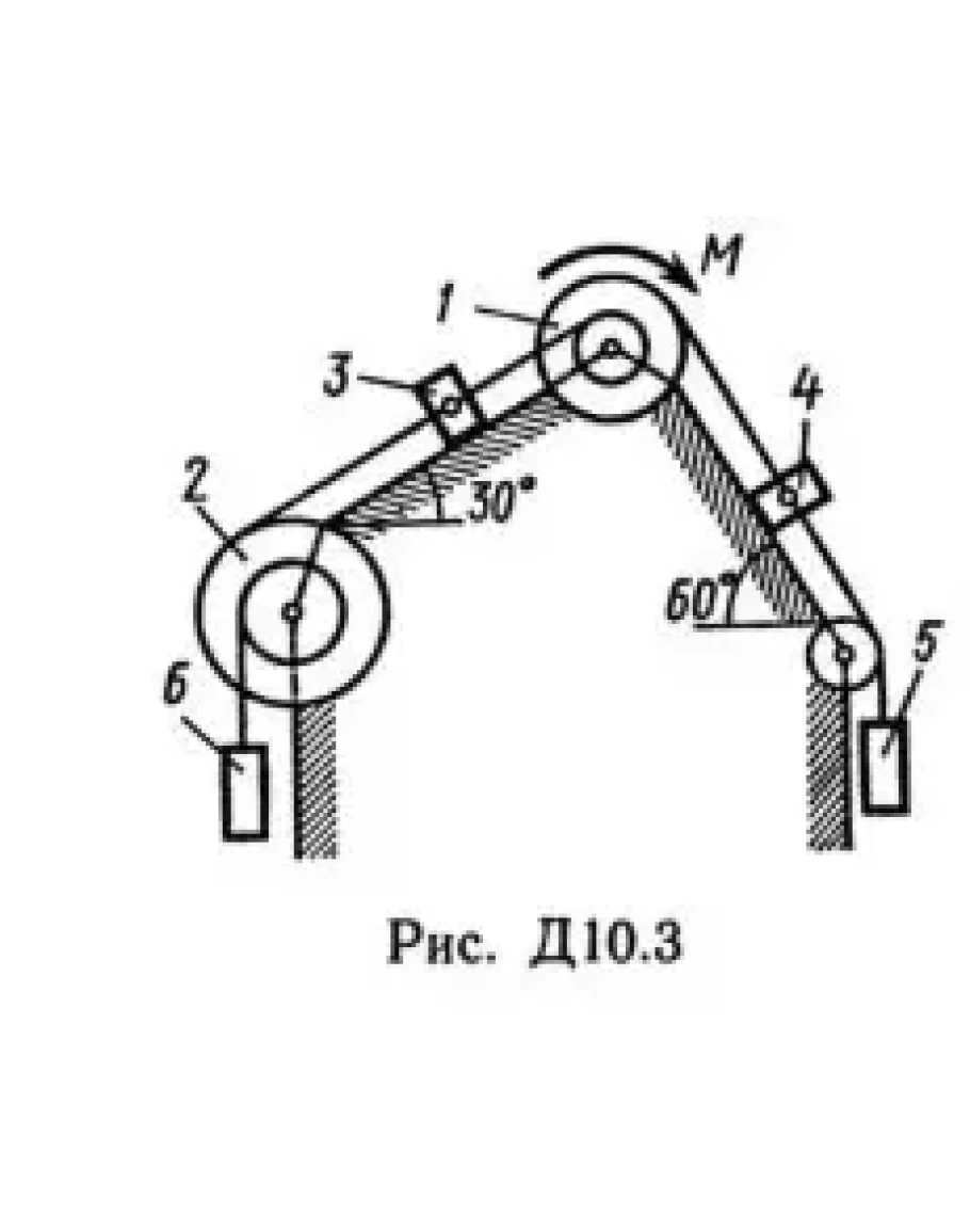 Механическая система состоит из однородных ступенчатых шкивов 1 и 2, обмотанных нитями, грузов 3—6, прикрепленных к этим нитям, и невесомого блока (рис. Д10.0 — Д10.9, табл. Д10). Система движется в вертикальной плоскости под действием сил тяжести и пары сил с моментом М, приложенной к одному из шкивов. Радиусы ступеней шкива 1 равны: R1 = 0,2 м, r1 — 0,1 м, а шкива 2 — R2 = 0,3 м, r2 = 0,15 м; их радиусы инерции относительно осей вращения равны соответственно ρ1 = 0,1 м и ρ2 = 0,2 м. Пренебрегая трением, определить ускорение груза, имеющего больший вес; веса Р1, …, Р6 шкивов и грузов заданы в таблице в ньютонах. Грузы, веса которых равны нулю, на чертеже не изображать (шкивы 1, 2 изображать всегда как части системы).