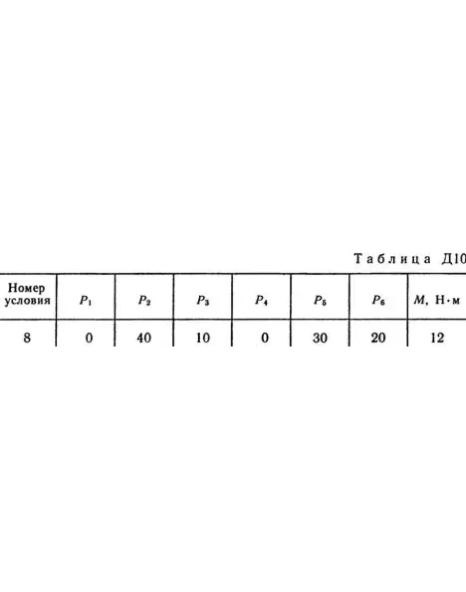 Механическая система состоит из однородных ступенчатых шкивов 1 и 2, обмотанных нитями, грузов 3—6, прикрепленных к этим нитям, и невесомого блока (рис. Д10.0 — Д10.9, табл. Д10). Система движется в вертикальной плоскости под действием сил тяжести и пары сил с моментом М, приложенной к одному из шкивов. Радиусы ступеней шкива 1 равны: R1 = 0,2 м, r1 — 0,1 м, а шкива 2 — R2 = 0,3 м, r2 = 0,15 м; их радиусы инерции относительно осей вращения равны соответственно ρ1 = 0,1 м и ρ2 = 0,2 м. Пренебрегая трением, определить ускорение груза, имеющего больший вес; веса Р1, …, Р6 шкивов и грузов заданы в таблице в ньютонах. Грузы, веса которых равны нулю, на чертеже не изображать (шкивы 1, 2 изображать всегда как части системы).