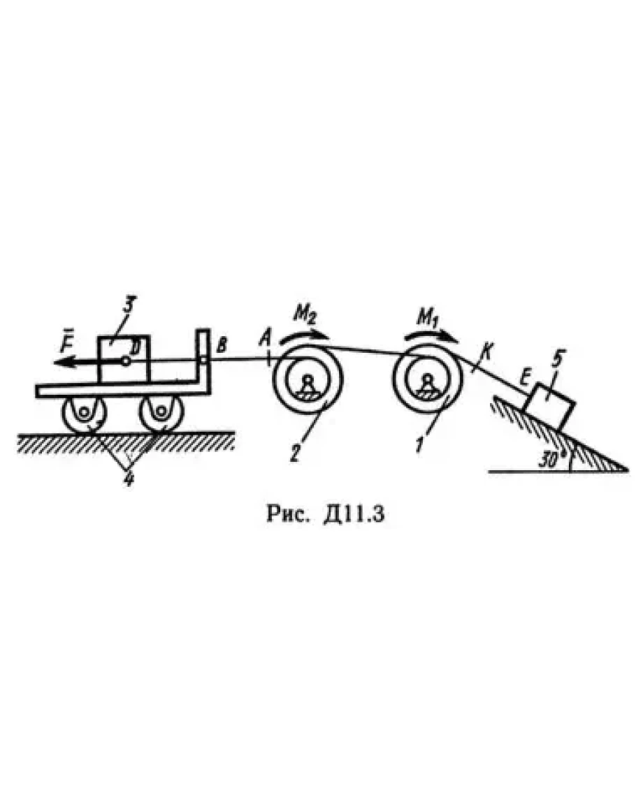 Механическая система состоит из тел 1, 2, …, 5 весом P1, Р2, …, P5 соответственно, связанных друг с другом нитями, намотанными на ступенчатые блоки 1 и 2 (рис. Д11.0 — Д11.9, табл. Д11). Радиусы ступенчатых блоков 1 и 2 равны соответственно R1 = R, r1 = 0,4R, R2 = R, r2 = 0,8R. При вычислении моментов инерции все блоки, катки и колеса считать однородными сплошными цилиндрами радиуса R. На систему кроме сил тяжести действует сила F, приложенная к телу 3 или 4 (если тело 3 в систему не входит, сила приложена в точке В к тележке), и пары сил с моментами М1, M2, приложенные к блокам 1 и 2; когда М<0, направление момента противоположно показанному на рисунке. На участке нити, указанном в таблице в столбце «Пружина», включена пружина с коэффициентом жесткости с (например, если в столбце стоит АВ, то участок АВ является пружиной, если AD, то AD — пружина и т.д.); в начальный момент времени пружина не деформирована. Составить для системы уравнения Лагранжа и найти закон изменения обобщенной координаты x, т. е. x = f(t), считая, что движение начинается из состояния покоя; определить также частоту и период колебаний, совершаемых телами системы при ее движении (о выборе координаты x см. «Указания»). Прочерк в столбцах таблицы, где заданы веса, означает, что соответствующее тело в систему не входит (на чертеже не изображать), а ноль — что тело считается невесомым, но в систему входит; для колес, обозначенных номером 4, Р4 — их общий вес (вес платформы такой тележки не учитывается).