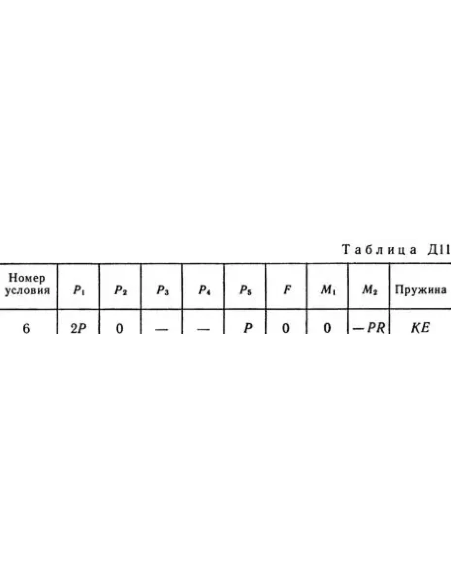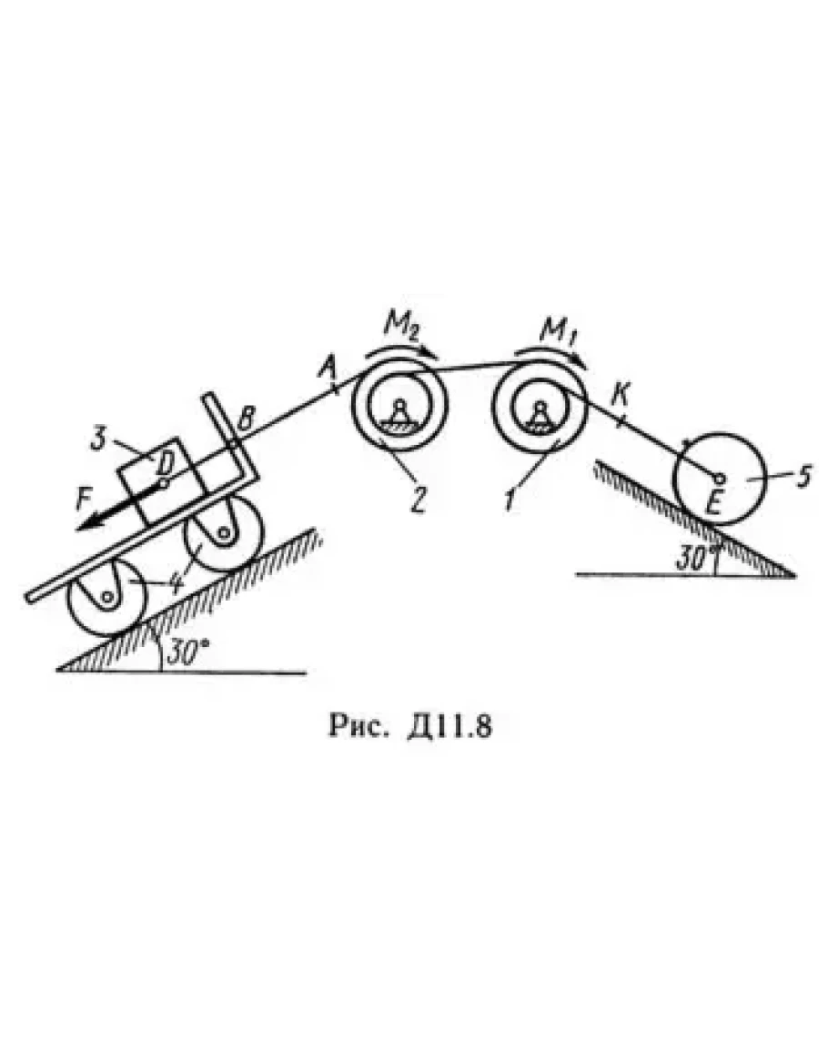 Механическая система состоит из тел 1, 2, …, 5 весом P1, Р2, …, P5 соответственно, связанных друг с другом нитями, намотанными на ступенчатые блоки 1 и 2 (рис. Д11.0 — Д11.9, табл. Д11). Радиусы ступенчатых блоков 1 и 2 равны соответственно R1 = R, r1 = 0,4R, R2 = R, r2 = 0,8R. При вычислении моментов инерции все блоки, катки и колеса считать однородными сплошными цилиндрами радиуса R. На систему кроме сил тяжести действует сила F, приложенная к телу 3 или 4 (если тело 3 в систему не входит, сила приложена в точке В к тележке), и пары сил с моментами М1, M2, приложенные к блокам 1 и 2; когда М<0, направление момента противоположно показанному на рисунке. На участке нити, указанном в таблице в столбце «Пружина», включена пружина с коэффициентом жесткости с (например, если в столбце стоит АВ, то участок АВ является пружиной, если AD, то AD — пружина и т.д.); в начальный момент времени пружина не деформирована. Составить для системы уравнения Лагранжа и найти закон изменения обобщенной координаты x, т. е. x = f(t), считая, что движение начинается из состояния покоя; определить также частоту и период колебаний, совершаемых телами системы при ее движении (о выборе координаты x см. «Указания»). Прочерк в столбцах таблицы, где заданы веса, означает, что соответствующее тело в систему не входит (на чертеже не изображать), а ноль — что тело считается невесомым, но в систему входит; для колес, обозначенных номером 4, Р4 — их общий вес (вес платформы такой тележки не учитывается).