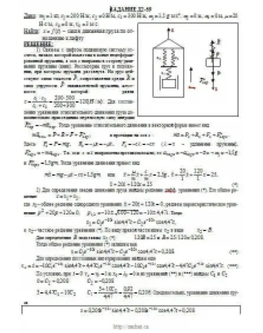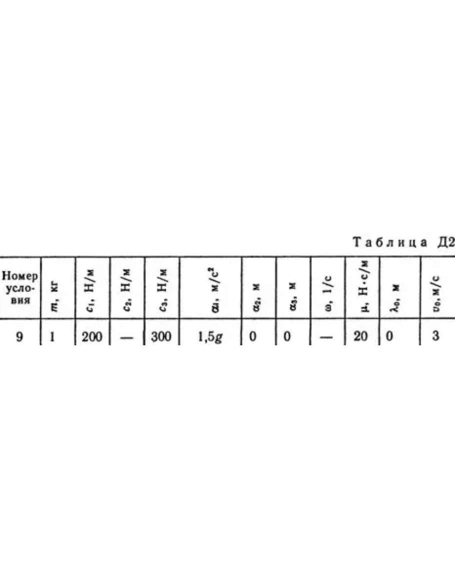 Груз 1 массой m укреплен на пружинной подвеске в лифте (рис. Д2.0 — Д2.9, табл. Д2). Лифт движется вертикально по закону z = 0,5α1t2 + α2sin(ωt) + α3cos(ωt) (ось z направлена по вертикали вверх; z выражено в метрах, t — в секундах). На груз действует сила сопротивления среды R = μv, где v — скорость груза по отношению к лифту. Найти закон движения груза по отношению к лифту, т. е. х = f(t); начало координат поместить в точке, где находится прикрепленный к грузу конец пружины, когда пружина не деформирована. При этом во избежание ошибок в знаках направить ось х в сторону удлинения пружины, а груз изобразить в положении, при котором х>0, т.е. пружина растянута. При подсчетах можно принять g = 10 м/с2. Массой пружин и соединительной планки 2 пренебречь. В таблице обозначено: c1, с2, c3 — коэффициенты жесткости пружин, λ0 — удлинение пружины с эквивалентной жесткостью в начальный момент времени t = 0, v0 — начальная скорость груза по отношению к лифту (направлена вертикально вверх). Прочерк в столбцах c1, с2, c3 означает, что соответствующая пружина отсутствует и на чертеже изображаться не должна. Если при этом конец одной из оставшихся пружин окажется свободным, его следует прикрепить в соответствующем месте или к грузу или к потолку (полу) лифта; то же следует сделать, если свободными окажутся соединенные планкой 2 концы обеих оставшихся пружин. Условие μ = 0 означает, что сила сопротивления R отсутствует.