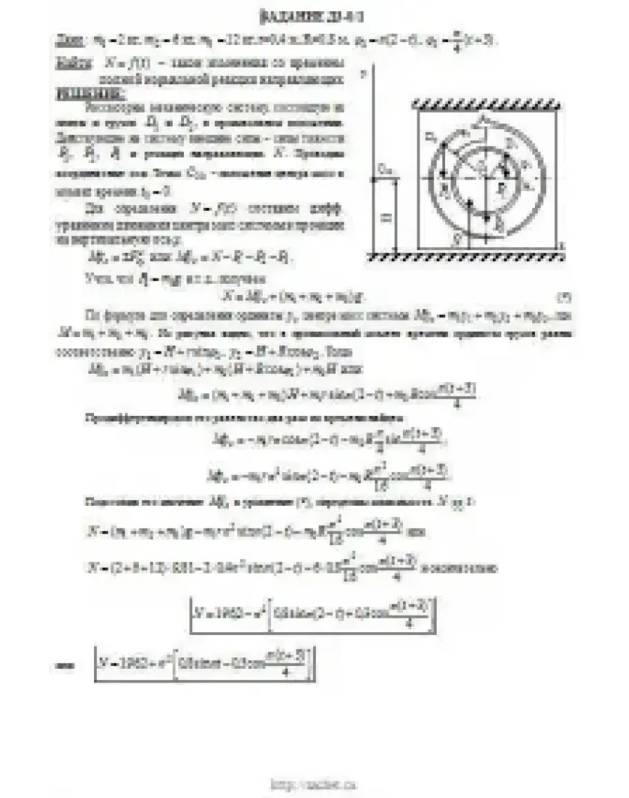 При движении грузов угол φ1 = ∠A2C3D1изменяется по закону φ1 = f1(t), а угол φ2 = ∠A2C3D2 — по закону φ2 = f2(t). В табл. ДЗ эти зависимости даны отдельно для рис. 0—4 и 5—9, где φ выражено в радианах, t — в секундах. Считая грузы материальными точками и пренебрегая всеми сопротивлениями, определить закон изменения со временем величины, указанной в таблице в столбце «Найти», т. е. x3 = t3(t) и N = f(t), где x3 — координата центра C3 плиты (зависимость x3 = f3(t) определяет закон движения плиты), N — полная нормальная реакция направляющих.